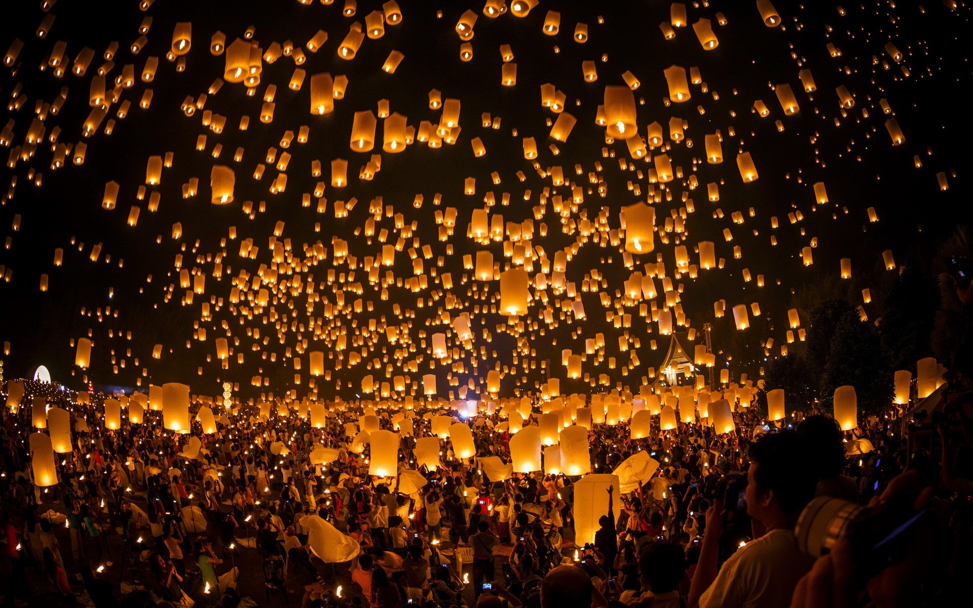 Description: A large group of people standing around a lot of lanterns in the air at night time with people looking on.
