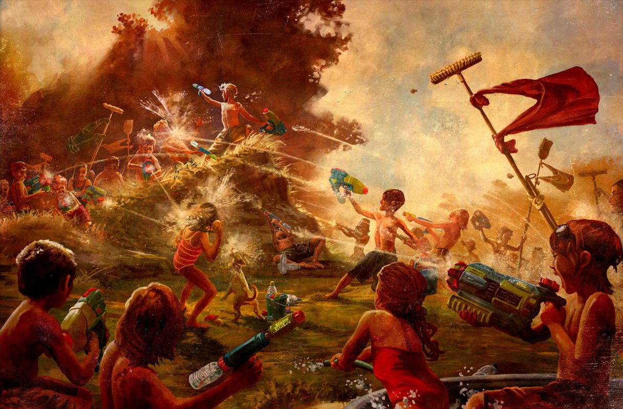 Description: A painting of a group of people playing with a fire hydrant and a lot of water on a hill.