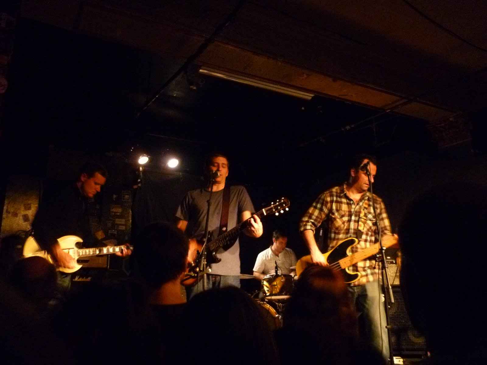 Description: A group of people playing instruments in a dark room with a crowd watching them on stage and a man standing on the side of the stage.