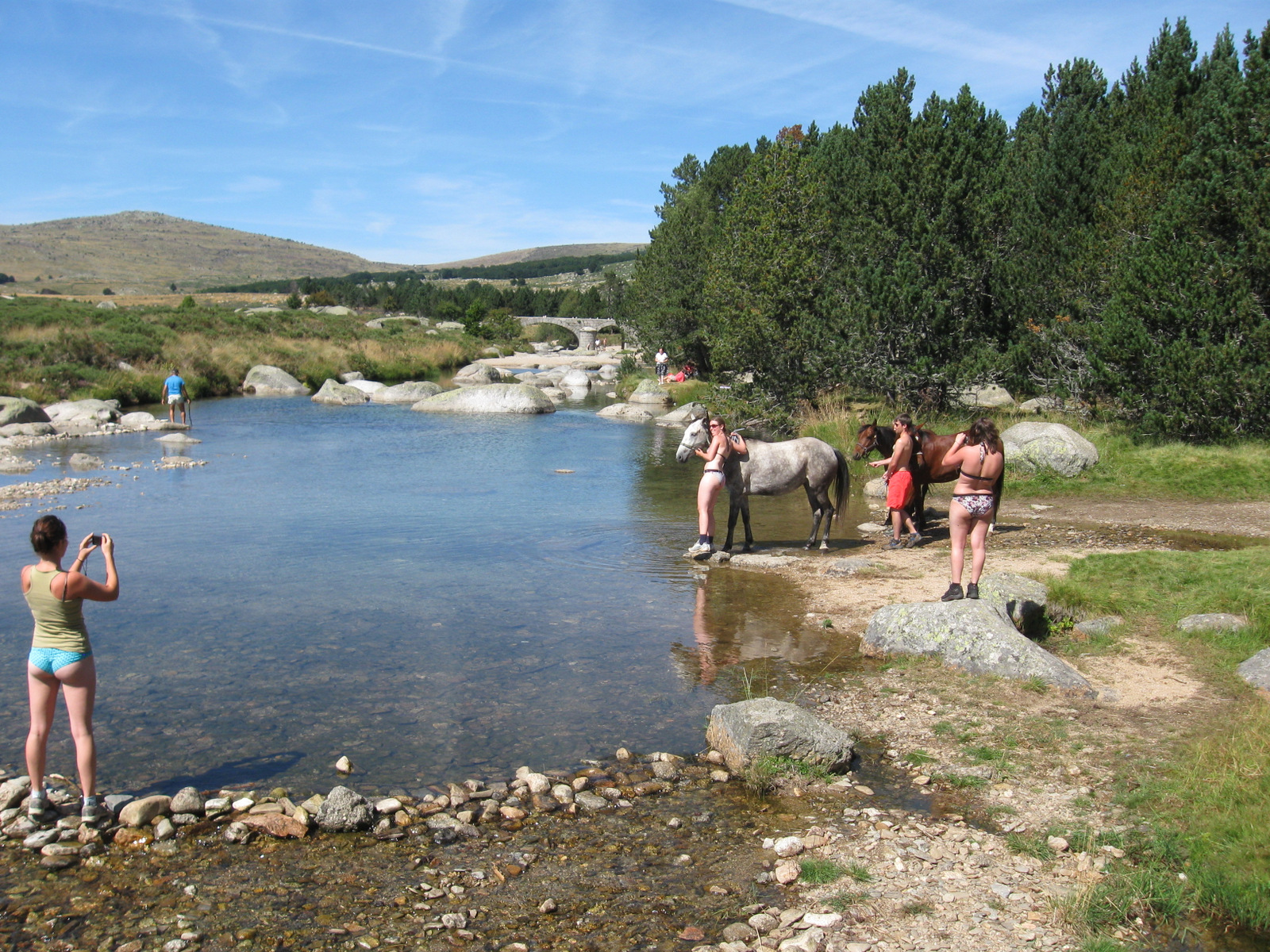 Description: A group of people standing around a river with horses in the water and a woman taking a picture of them.