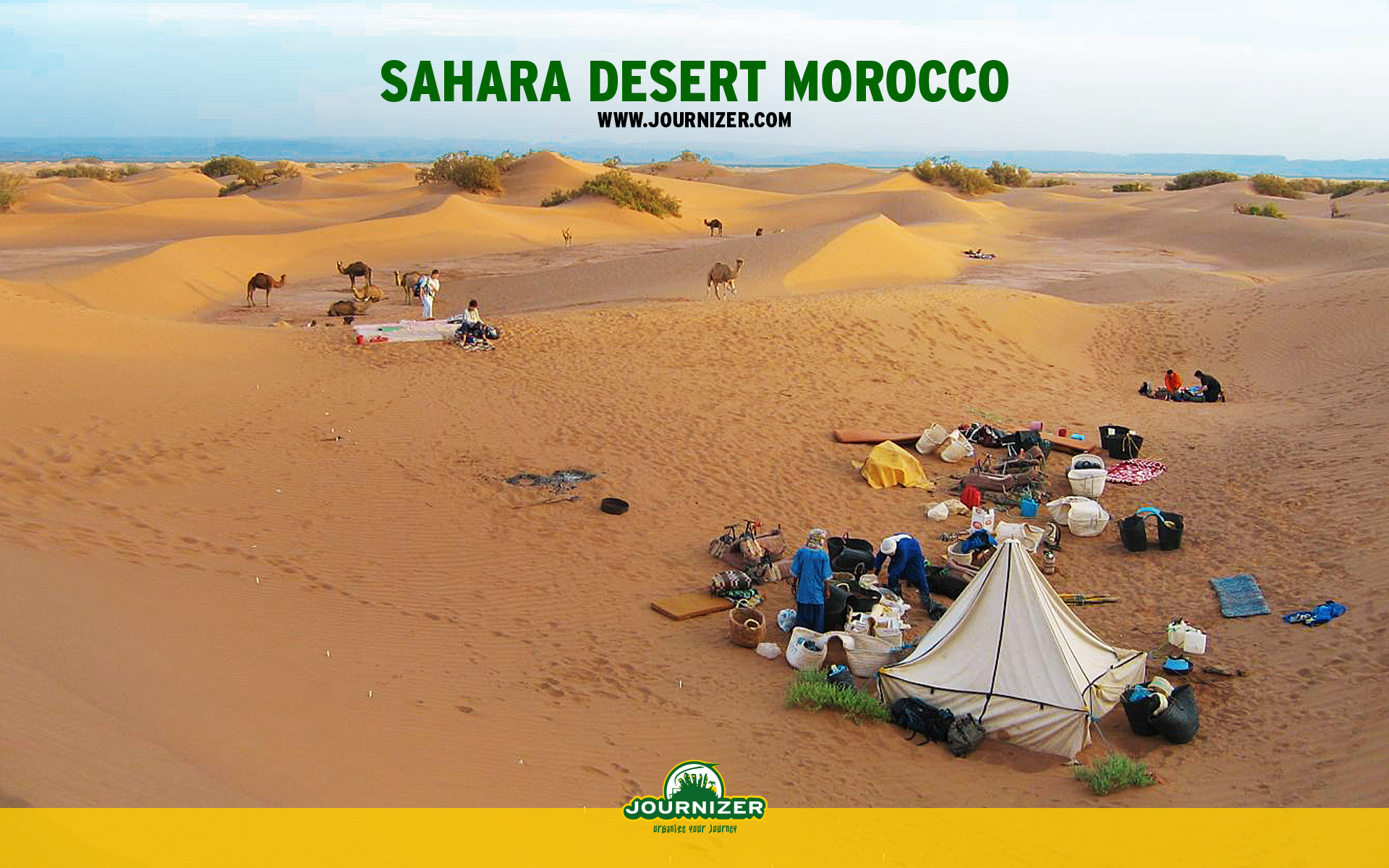 Description: A group of people sitting in the sand near a tent in the desert with a camel in the background.