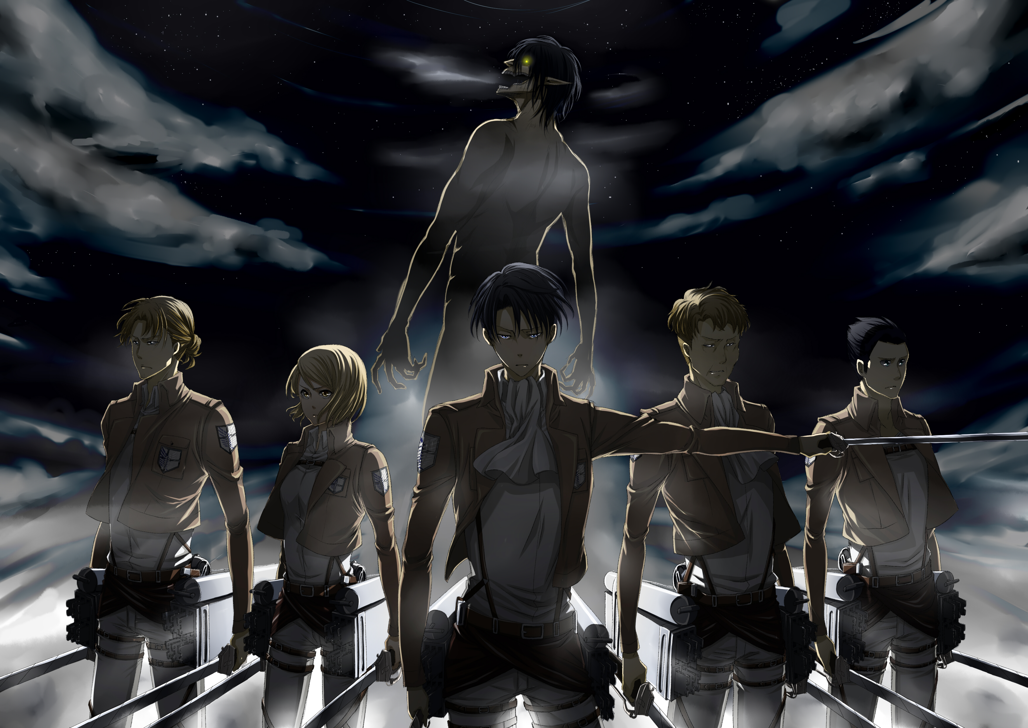 Description: A group of people standing in front of a sky with clouds and a person holding a sword in the middle.