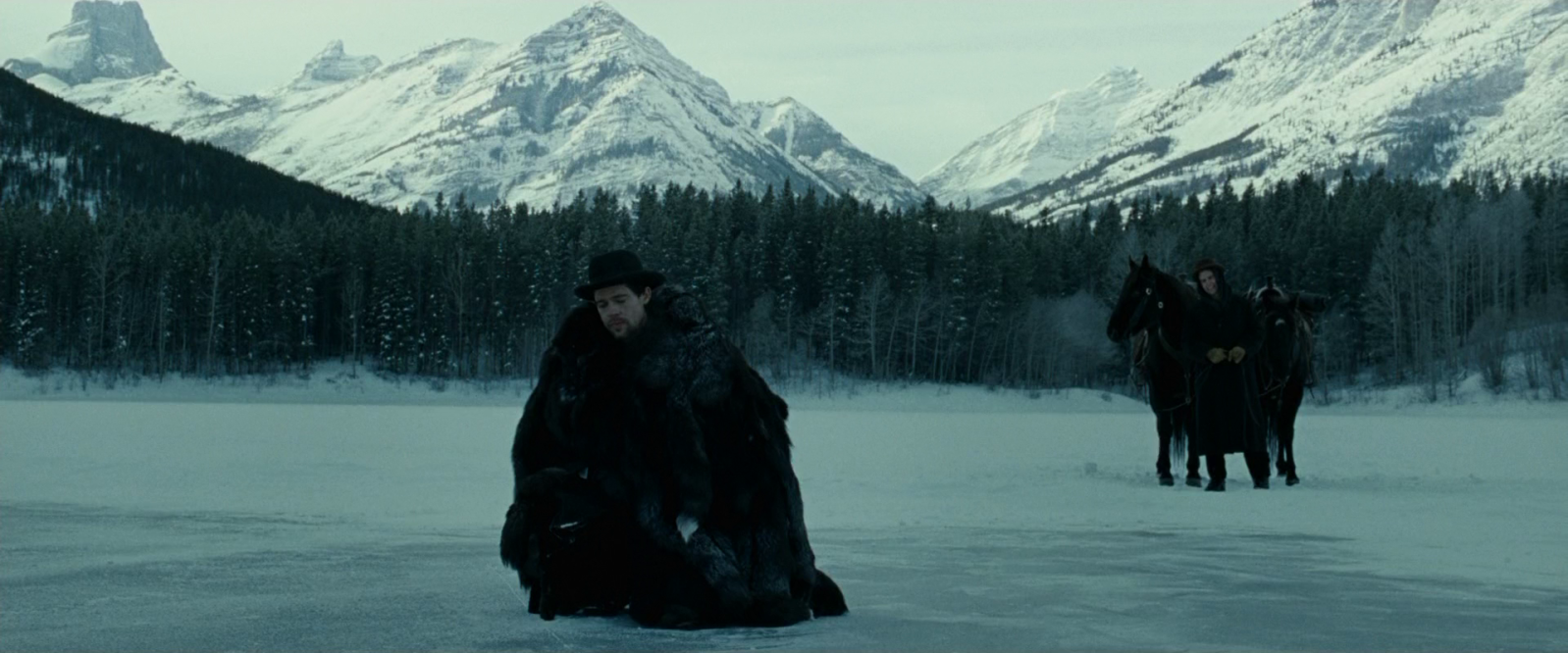 Description: A group of people standing in the snow near mountains and trees with a horse in the background and a man in a black coat.