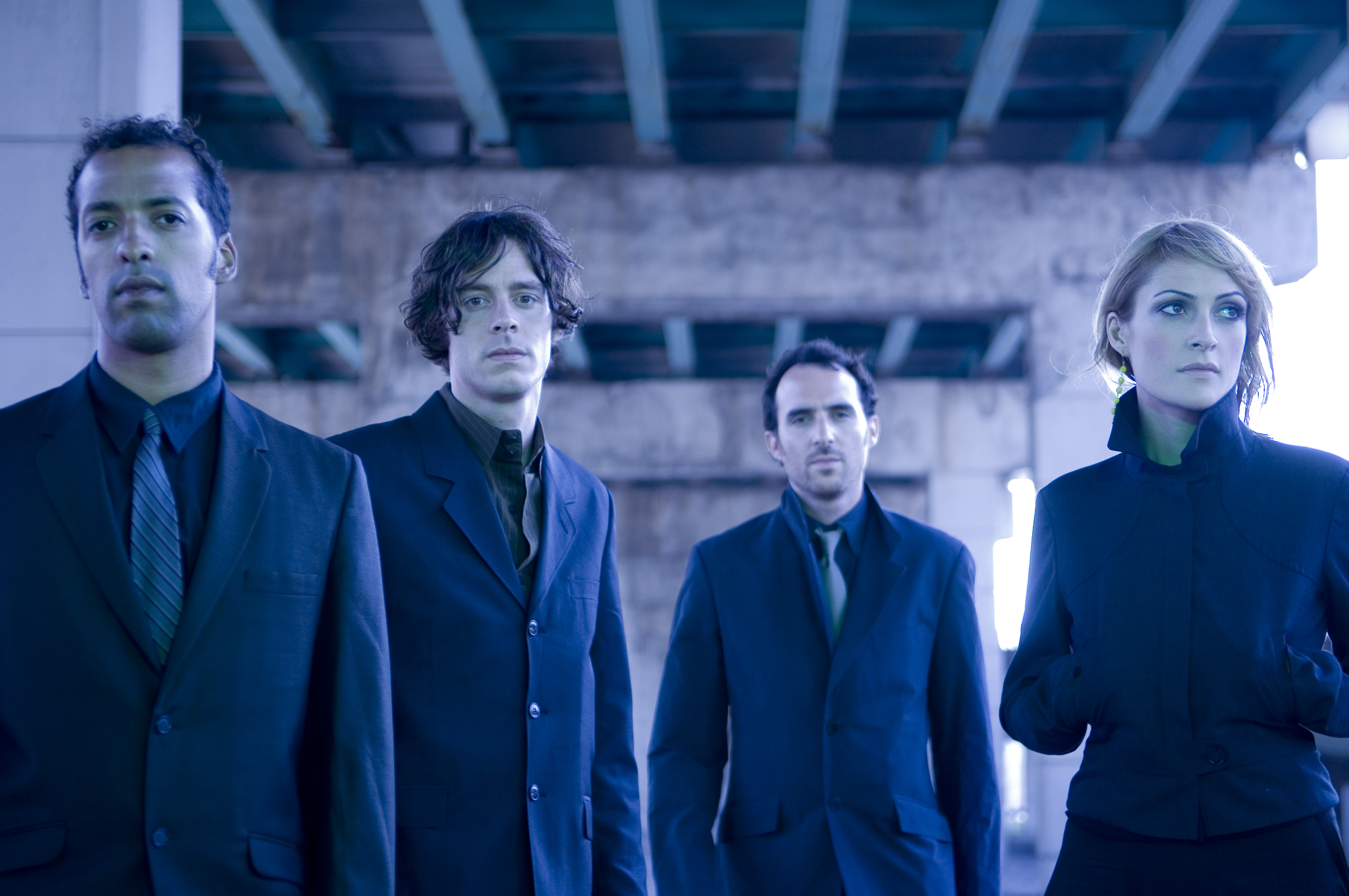 Description: A group of people standing next to each other in suits and ties in a building with a bridge in the background.
