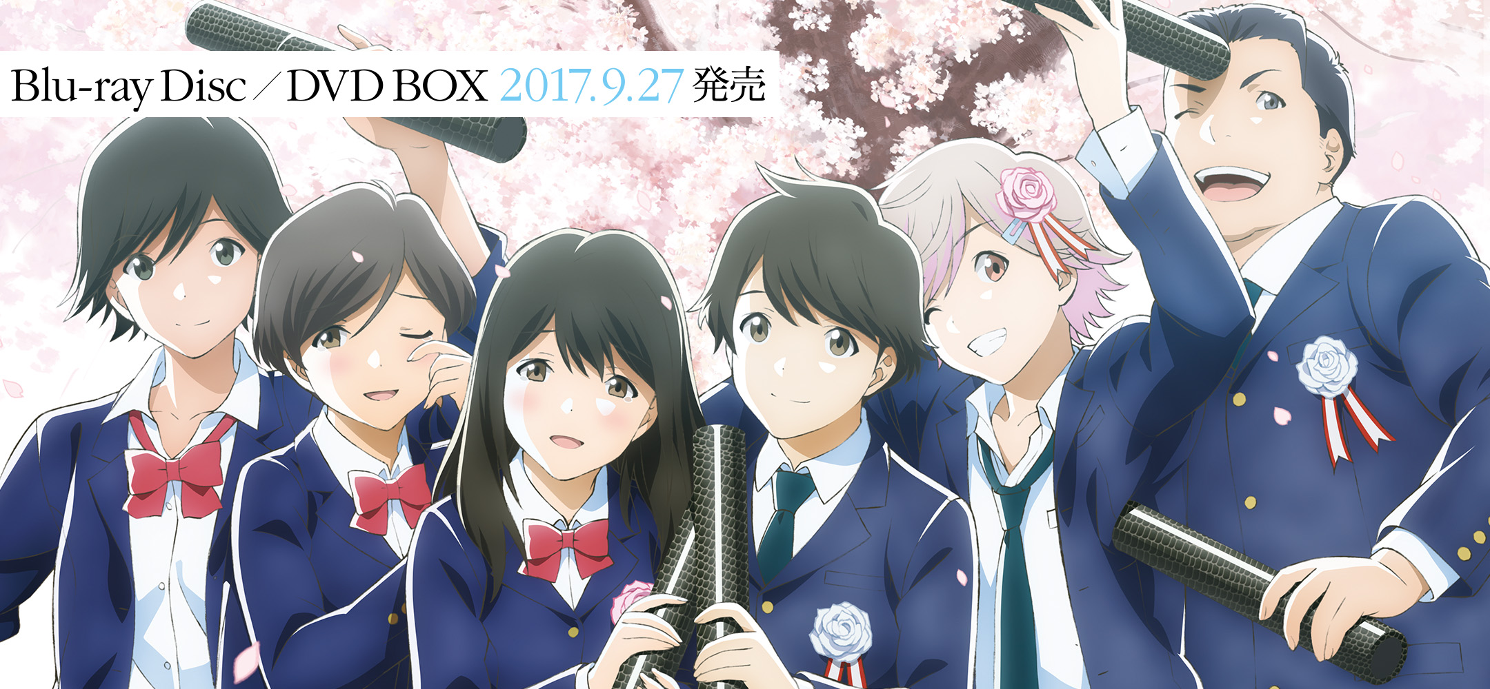 Description: A group of people in suits and ties holding a microphone and a cell phone in their hands with cherry blossoms in the background.