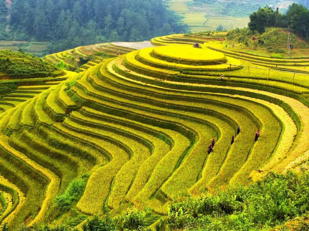 Description: A large group of people walking up a hill side covered in grass and trees.