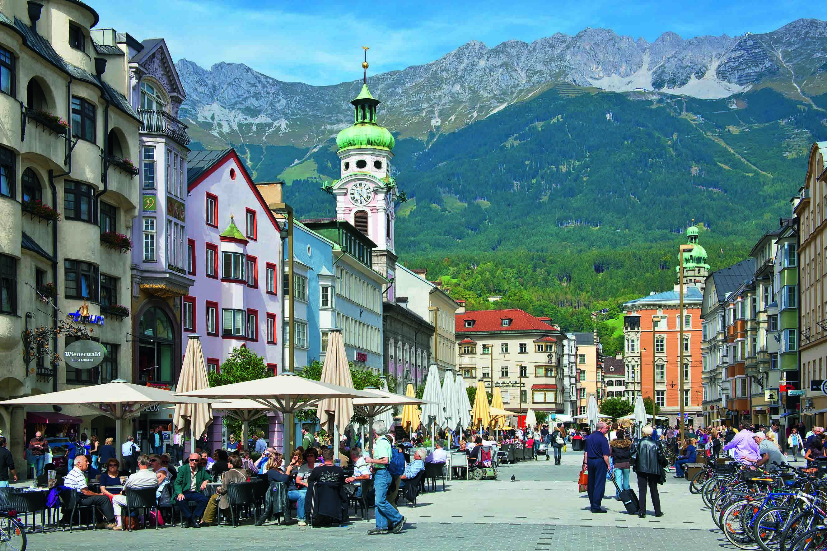 Description: A group of people walking down a street next to tall buildings with a clock tower on top of it.