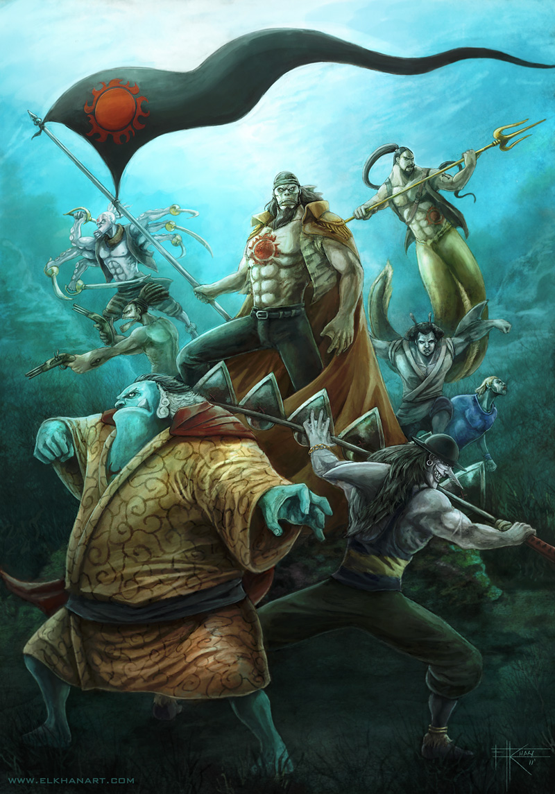 Description: A painting of a group of people in the water with a flag flying above them and a man on a horse.