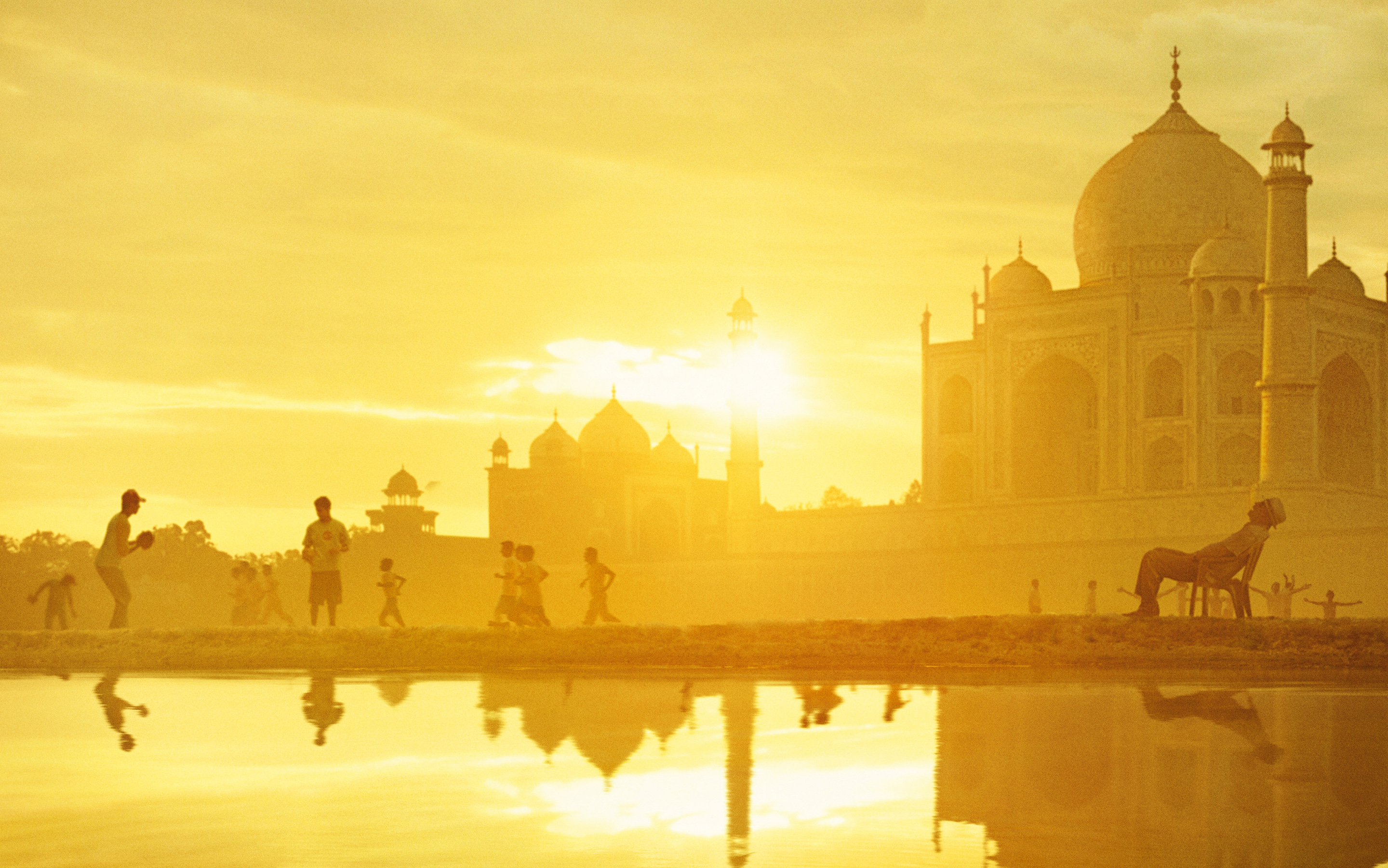 Description: A group of people standing around a body of water at sunset with a horse and carriage in the foreground.