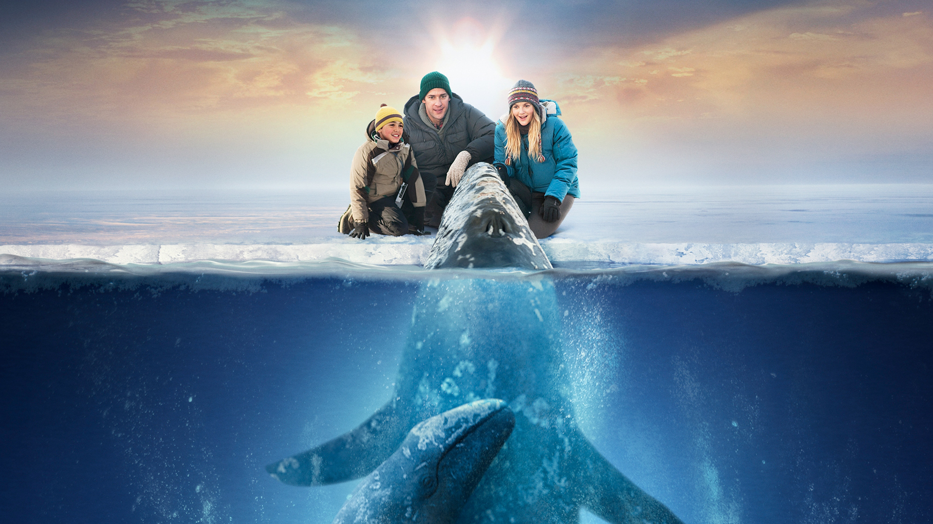 Description: A group of people riding on the back of a whale in the ocean under water with a sunset in the background.