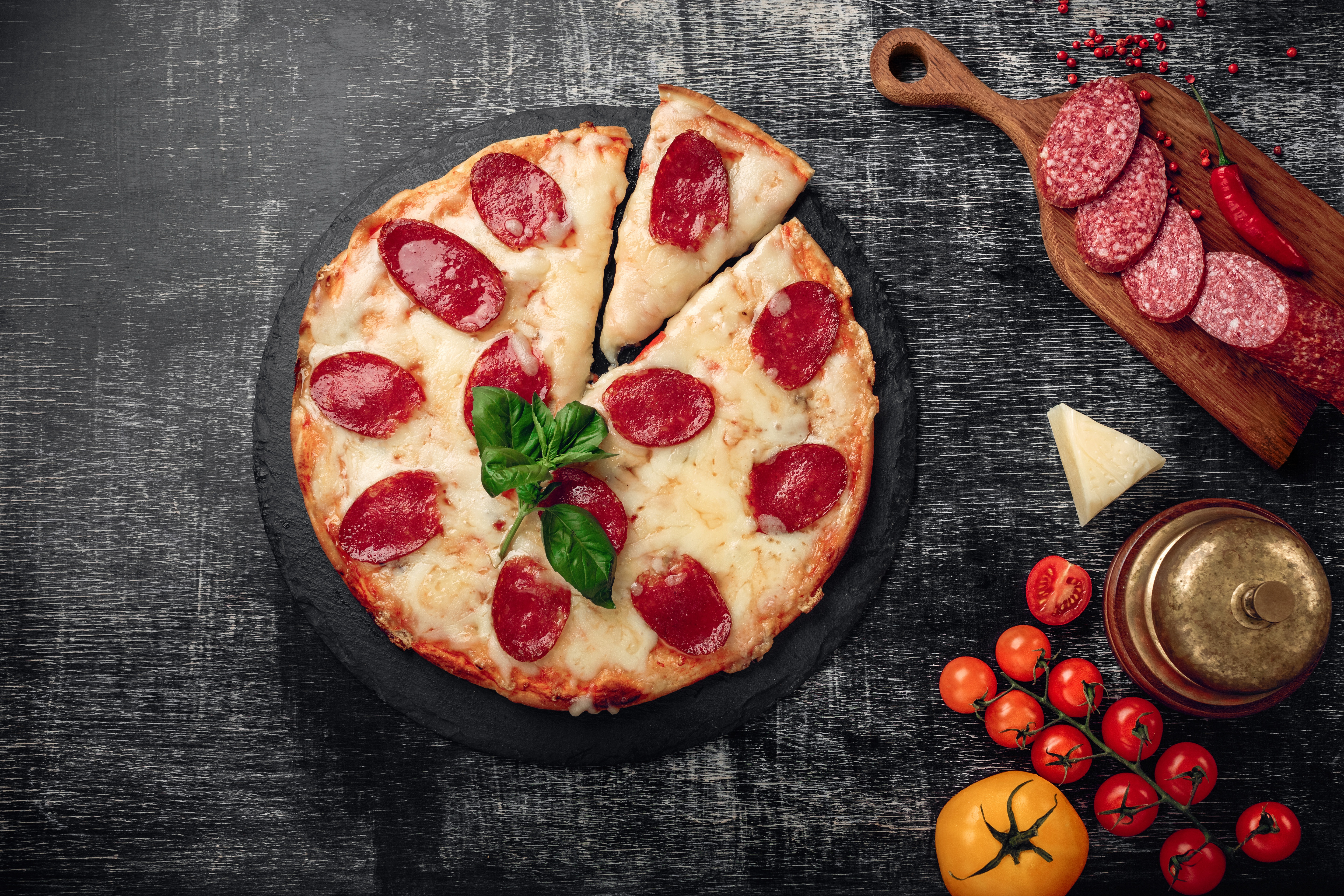 Description: A pepperoni pizza with a slice cut out of it and a slice of cheese on a plate next to it.
