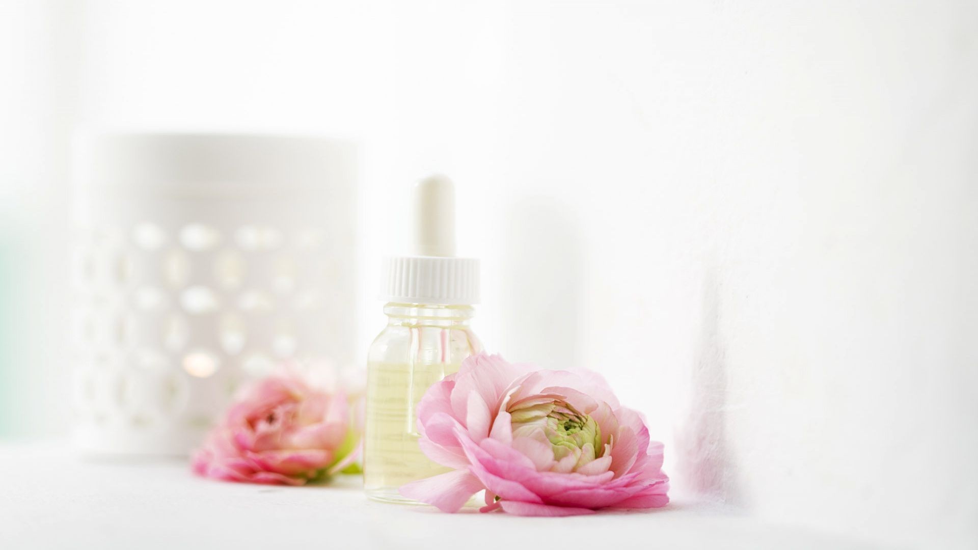 Description: A bottle of perfume sitting next to a pink flower on a table next to a white cup and a white candle.