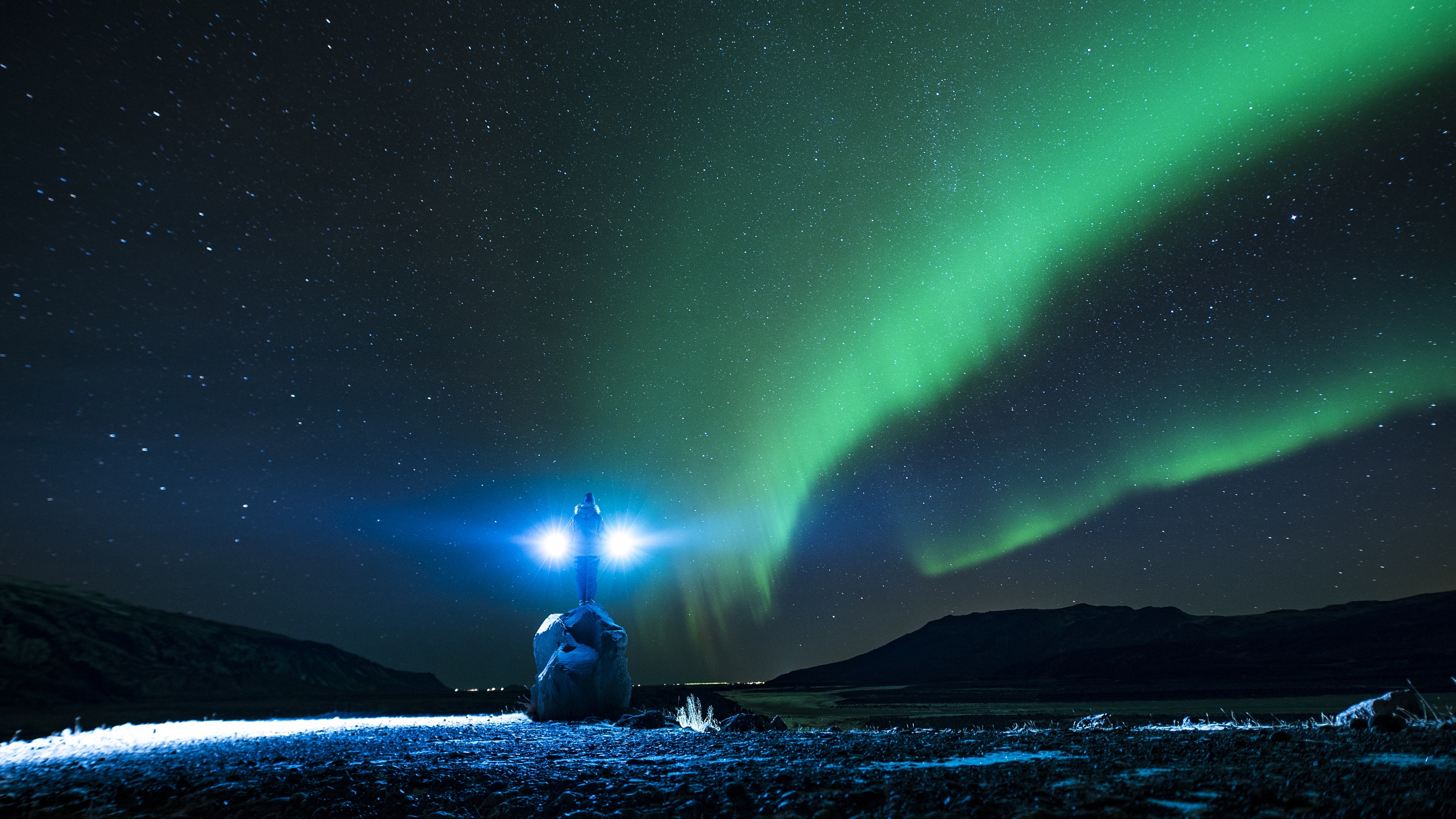 Description: A person sitting under a green and blue aurora light in the night sky with a flashlight in their hand.