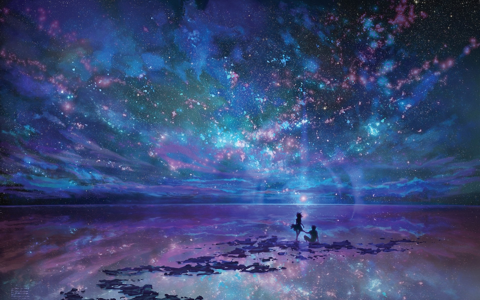 Description: A painting of a person standing on a beach under a night sky filled with stars and clouds.