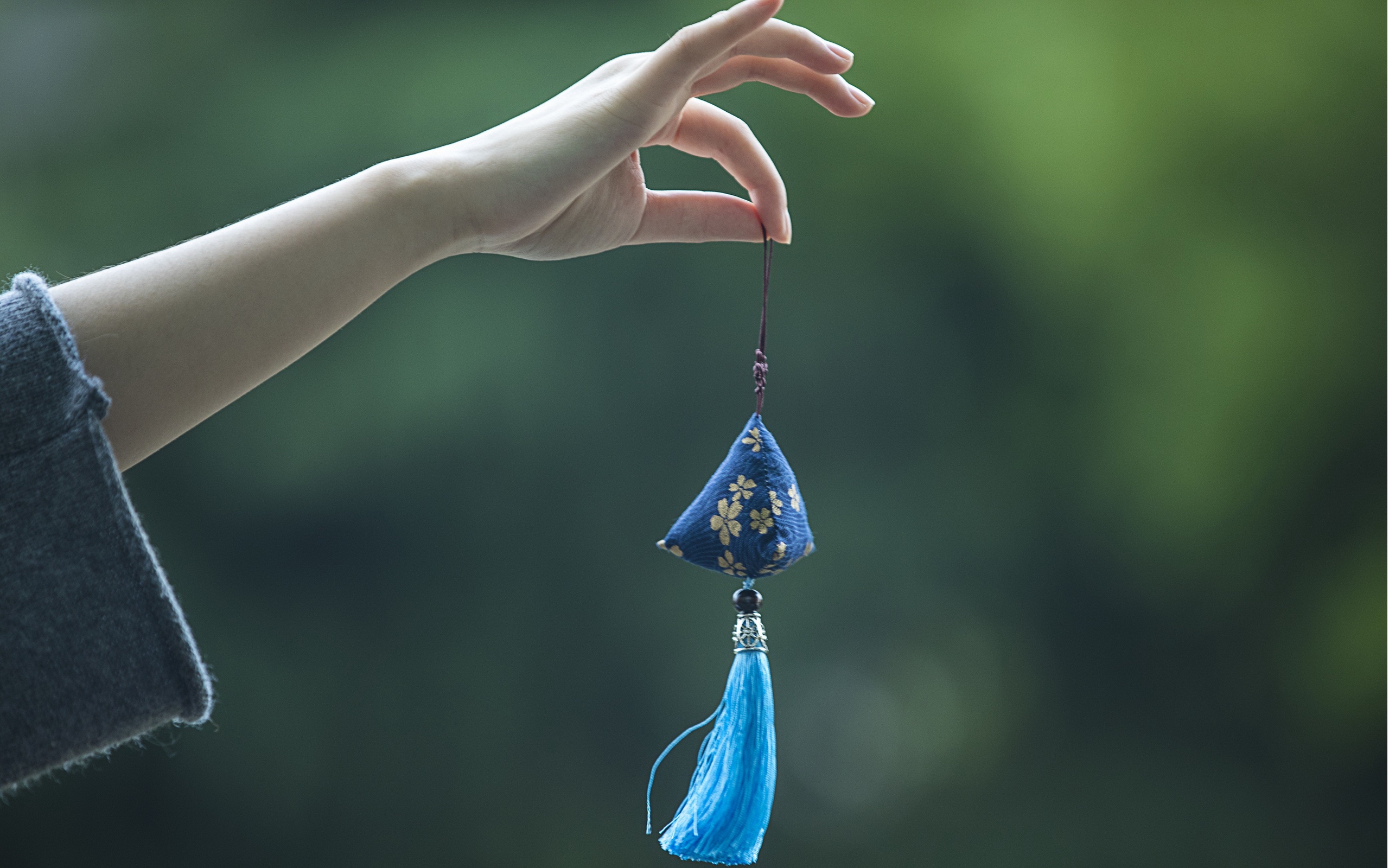 Description: A person holding a blue tasseled item in their hand with a blurry background of trees in the background.
