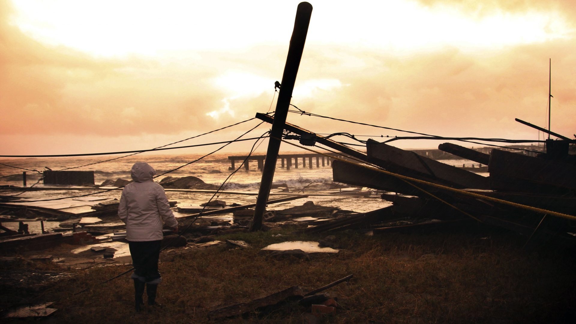 Description: A person standing in front of a boat on the beach at sunset or dawn with a cloudy sky in the background.