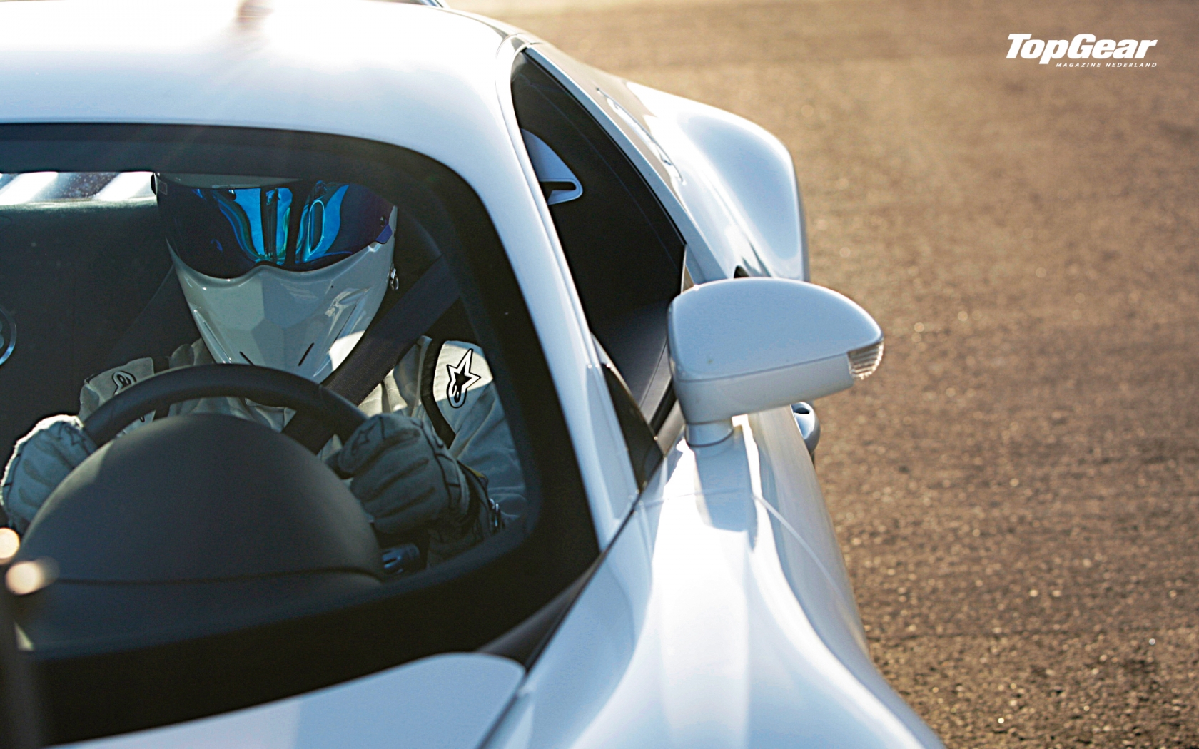 Description: A person in a car with a helmet on and a helmet on the driver's headlight is seen through the windshield.