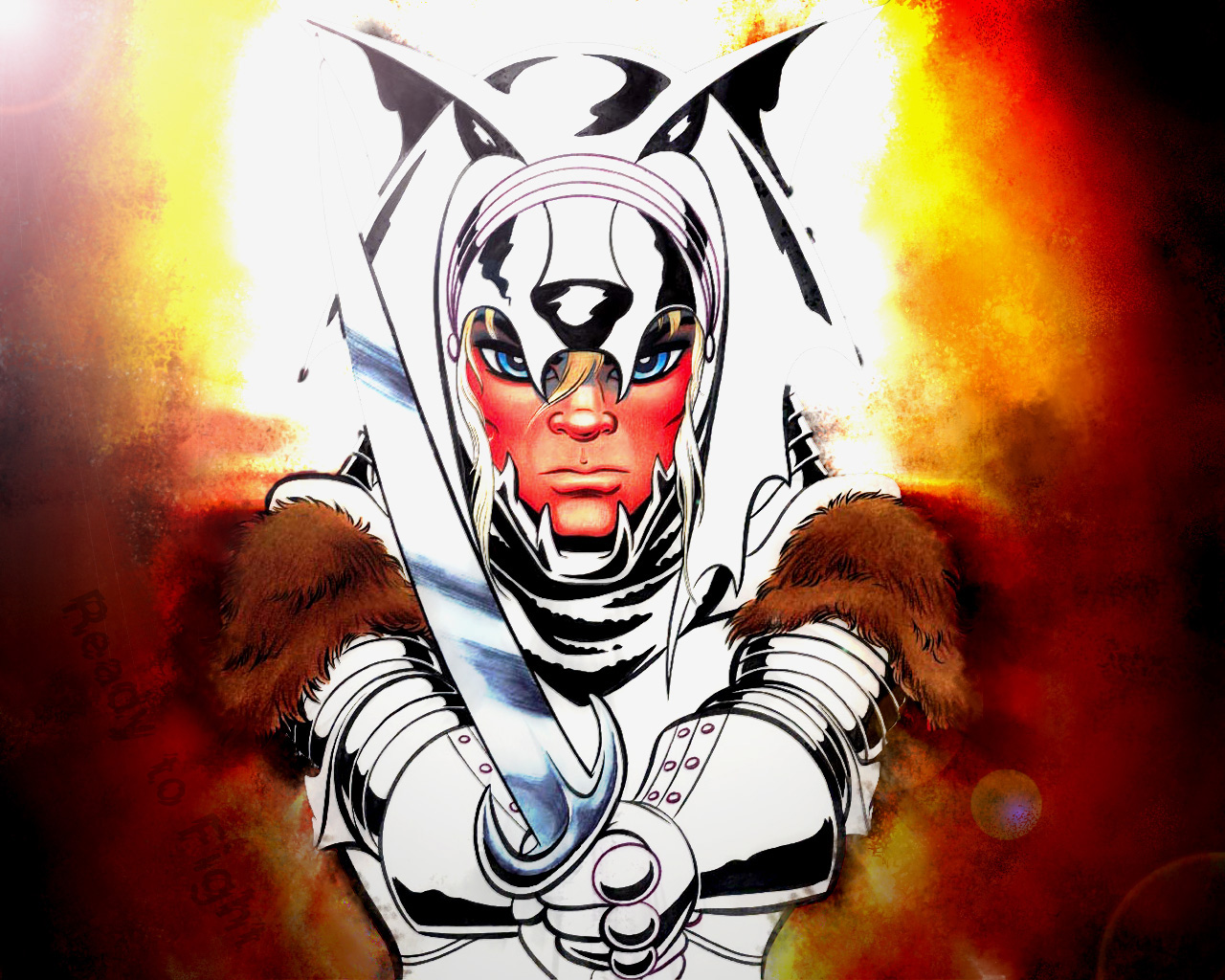 Description: A painting of a person with a cat mask and a sword in their hands and a red background behind it.