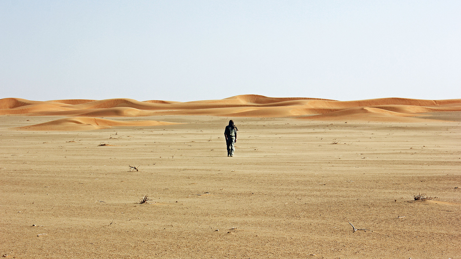Description: A person standing in the middle of a desert with sand dunes in the background and a sky background that is mostly clear.