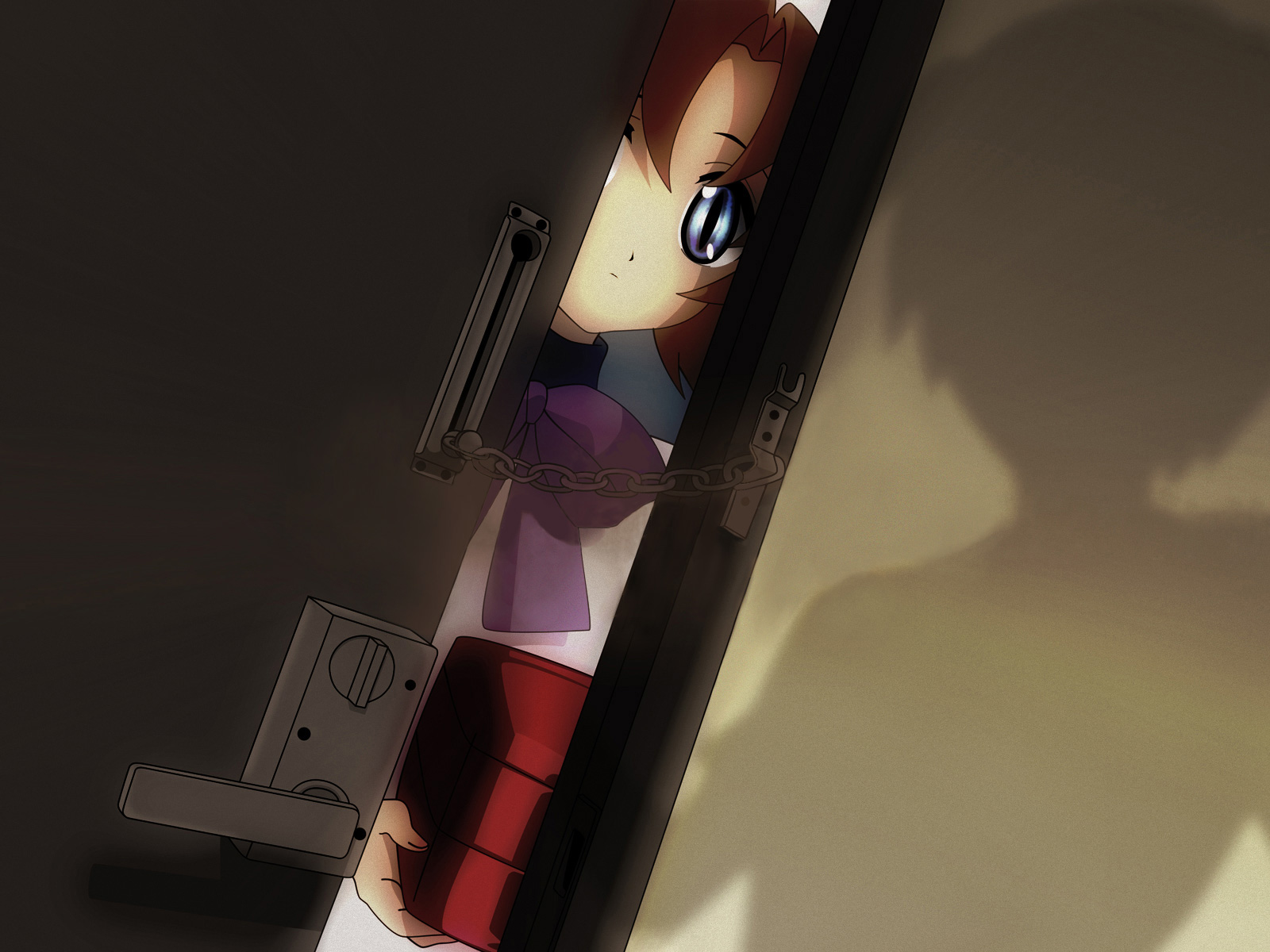Description: A person standing in front of a door with a shadow on the wall behind them and a door handle.