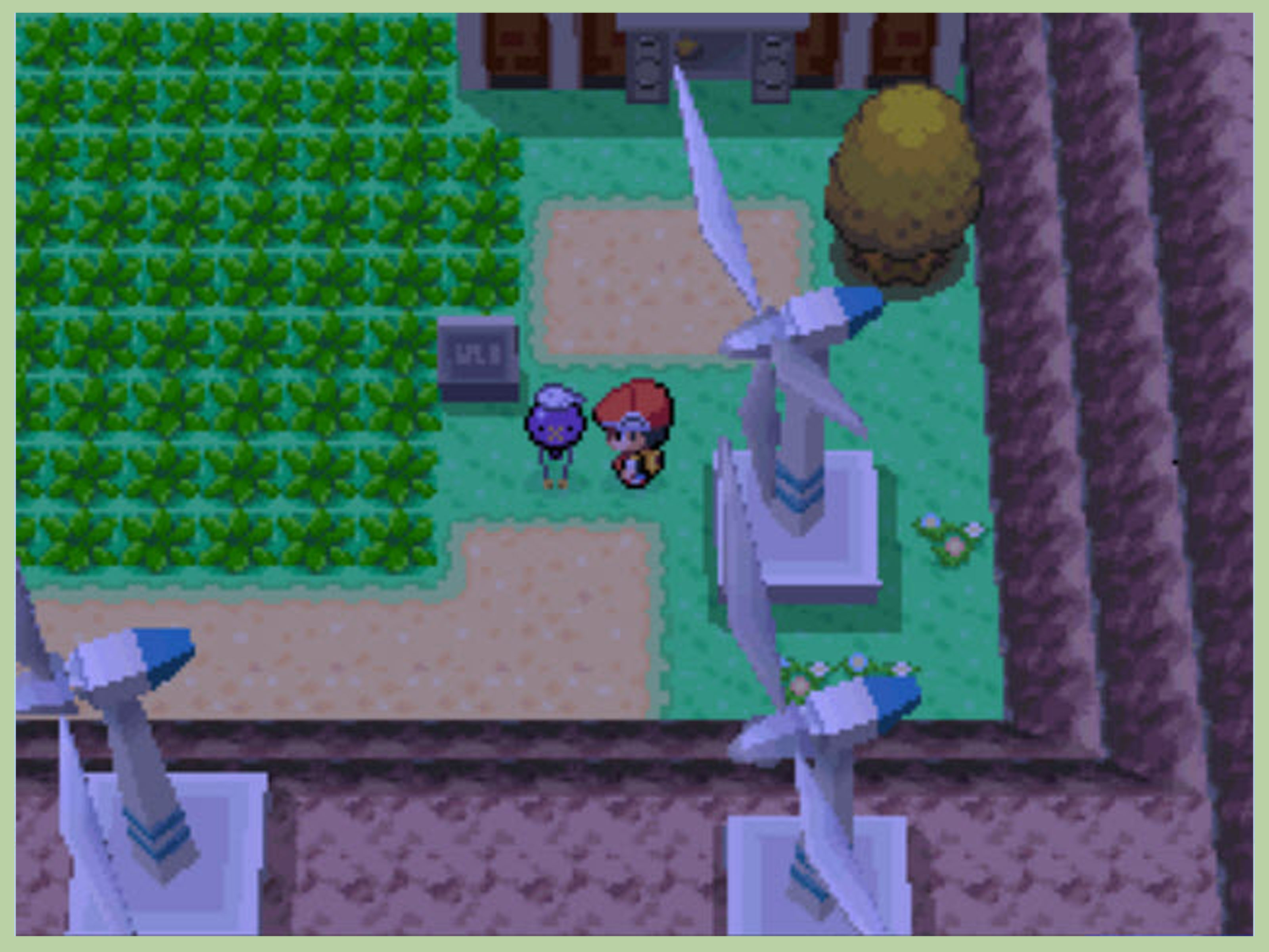 Description: A game screen showing a person in a field with a windmill and a tree in the background.