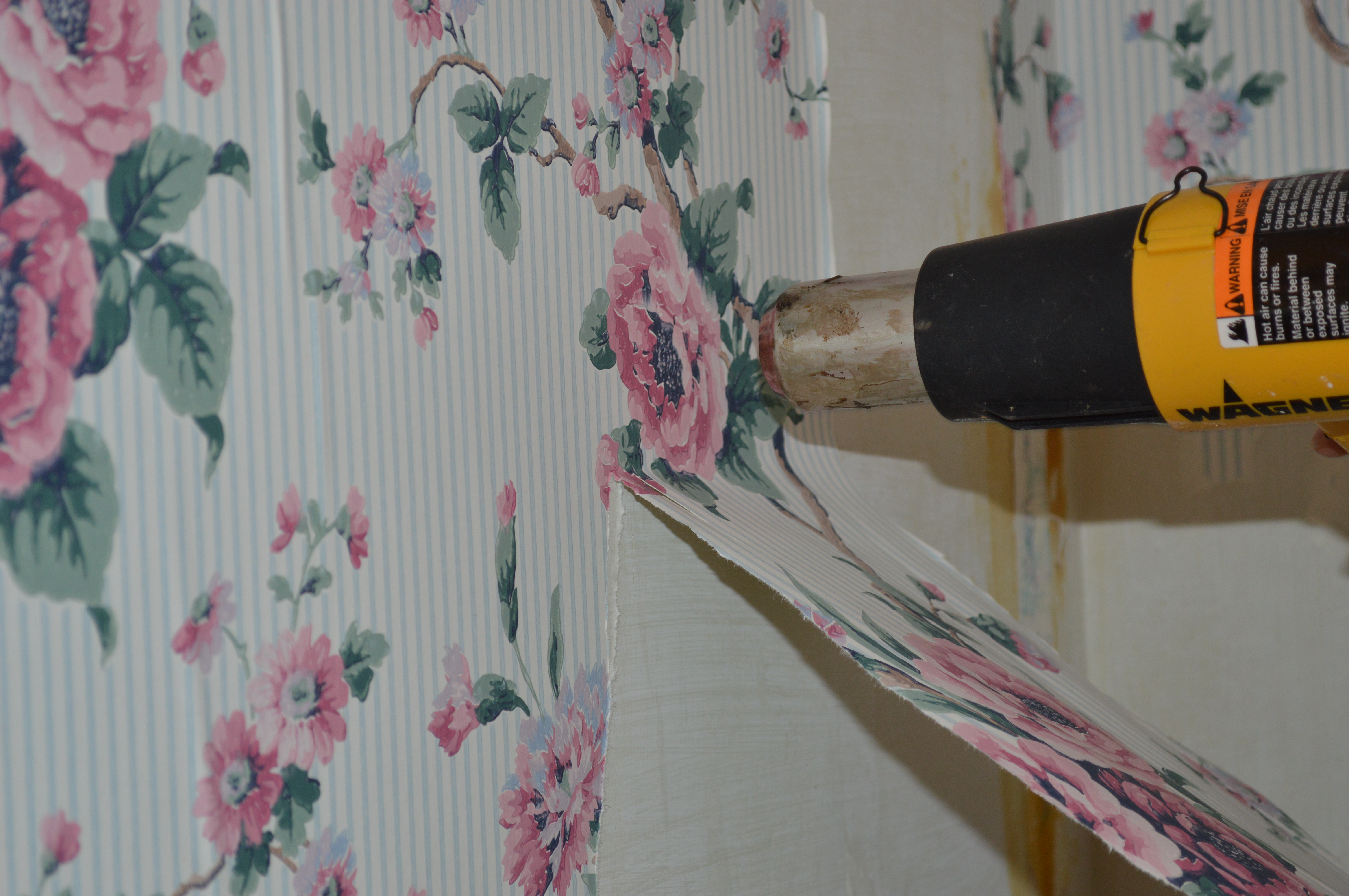 Description: A person using a glue gun to paint a flowered wallpaper with floral designs on it and a wall papered with a flower.