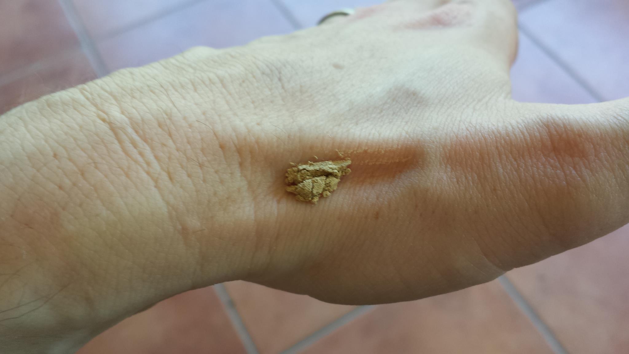 Description: A person with a small piece of gold on their left hand and a small piece of gold on their right hand.