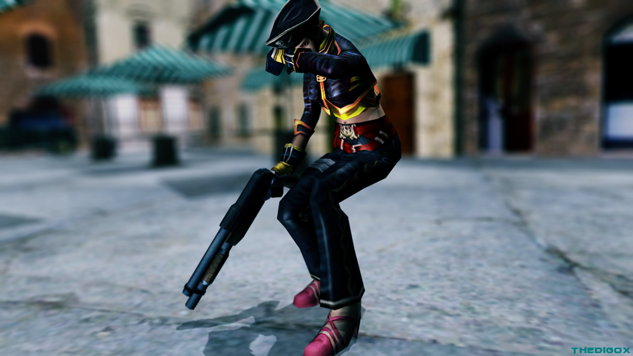 Description: A person with a gun in a virtual world setting with buildings in the background and a building with green roof.