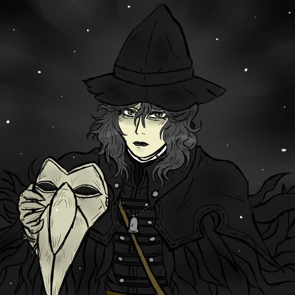 Description: A drawing of a person wearing a hat and holding a mask in front of a night sky with stars.