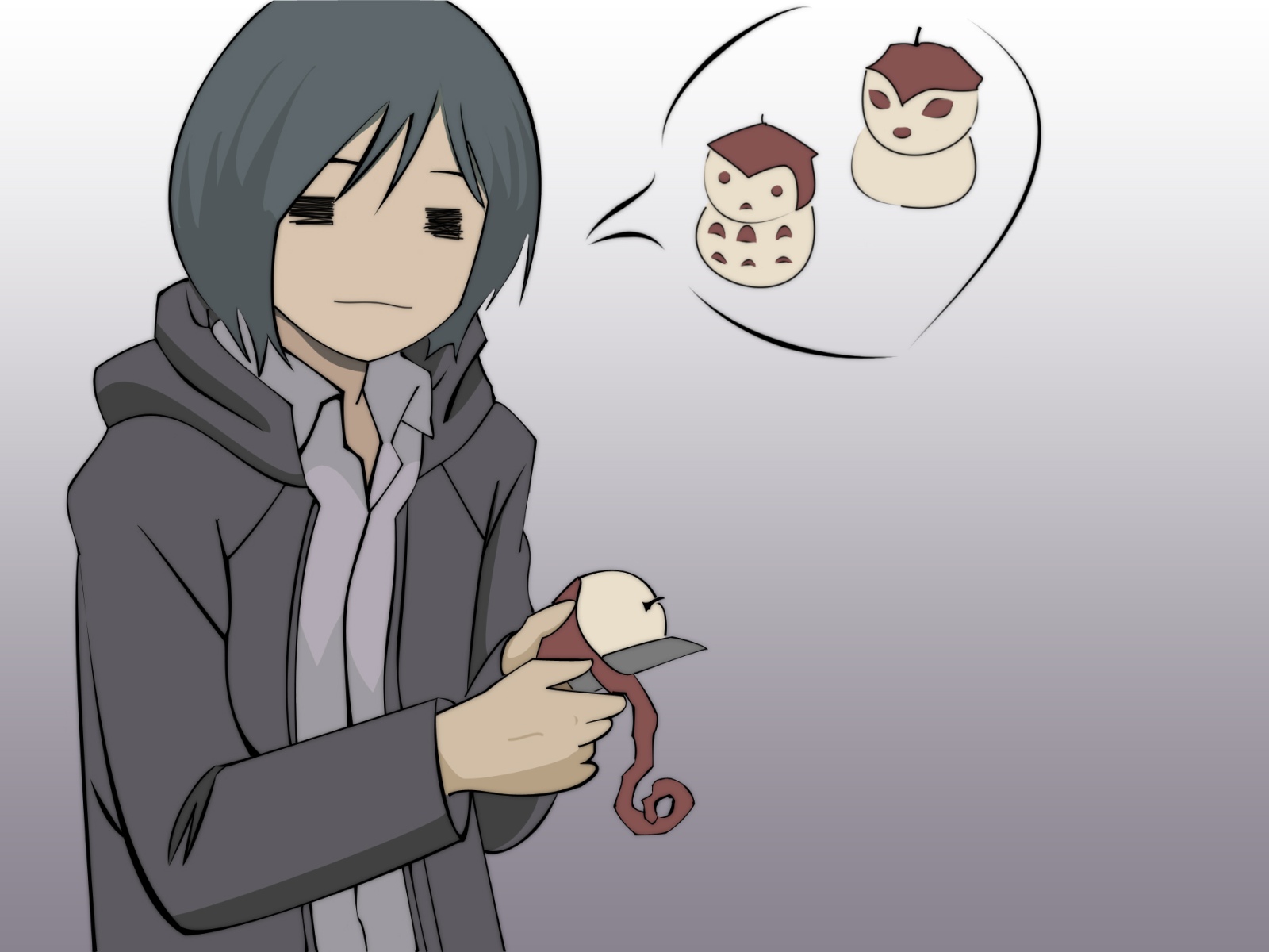 Description: A person holding a bird and a thought bubble with a cartoon character in the background that says.