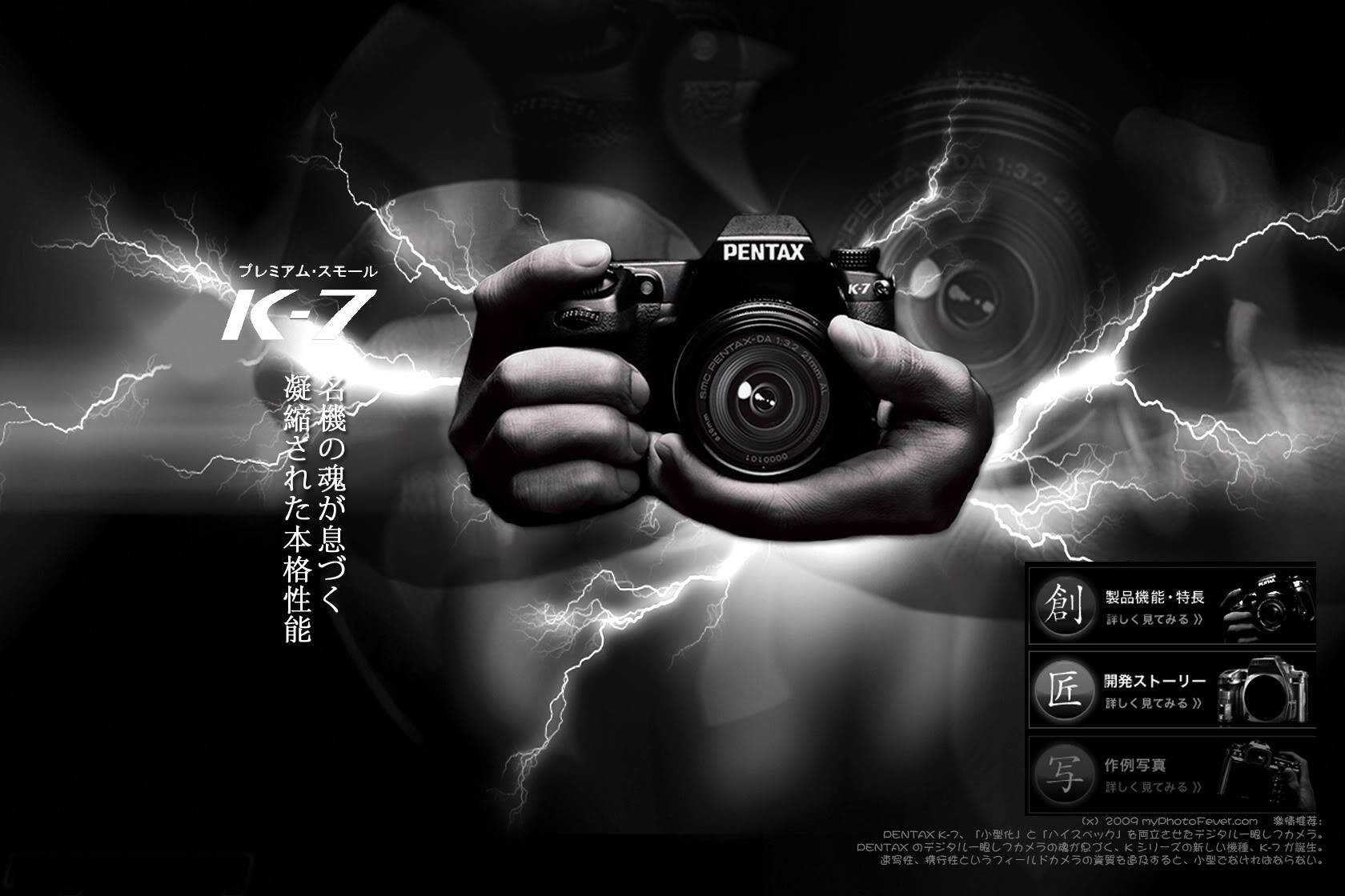 Description: A person holding a camera in their hands with lightning in the background and a dark background with lightning in the foreground.