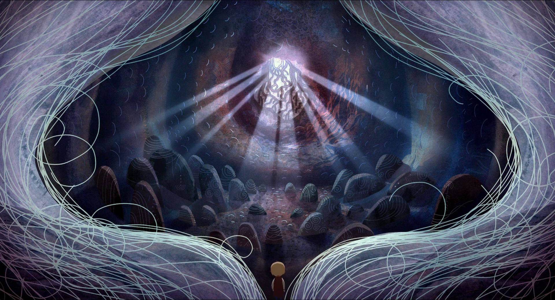 Description: A painting of a person holding a light in their hands with a light coming from the center of the image.