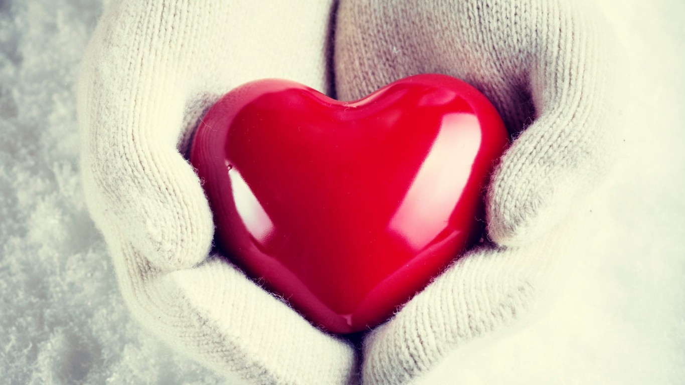 Description: A person holding a red heart in their hands in the snow.