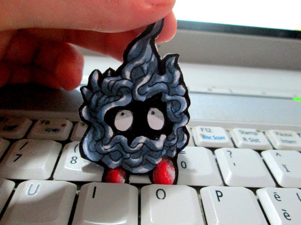 Description: A person is holding a small toy on a keyboard with a computer in the background and a computer keyboard in the foreground.