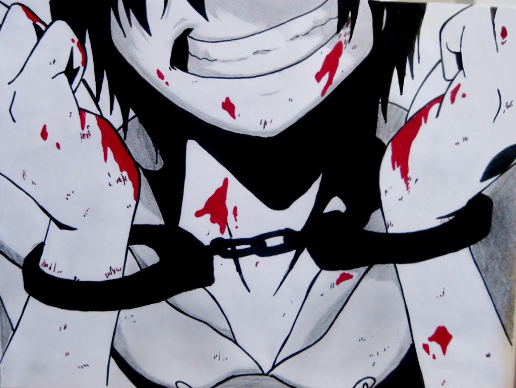 Description: A drawing of a person with a knife and a chain around their neck and hands in their pockets.