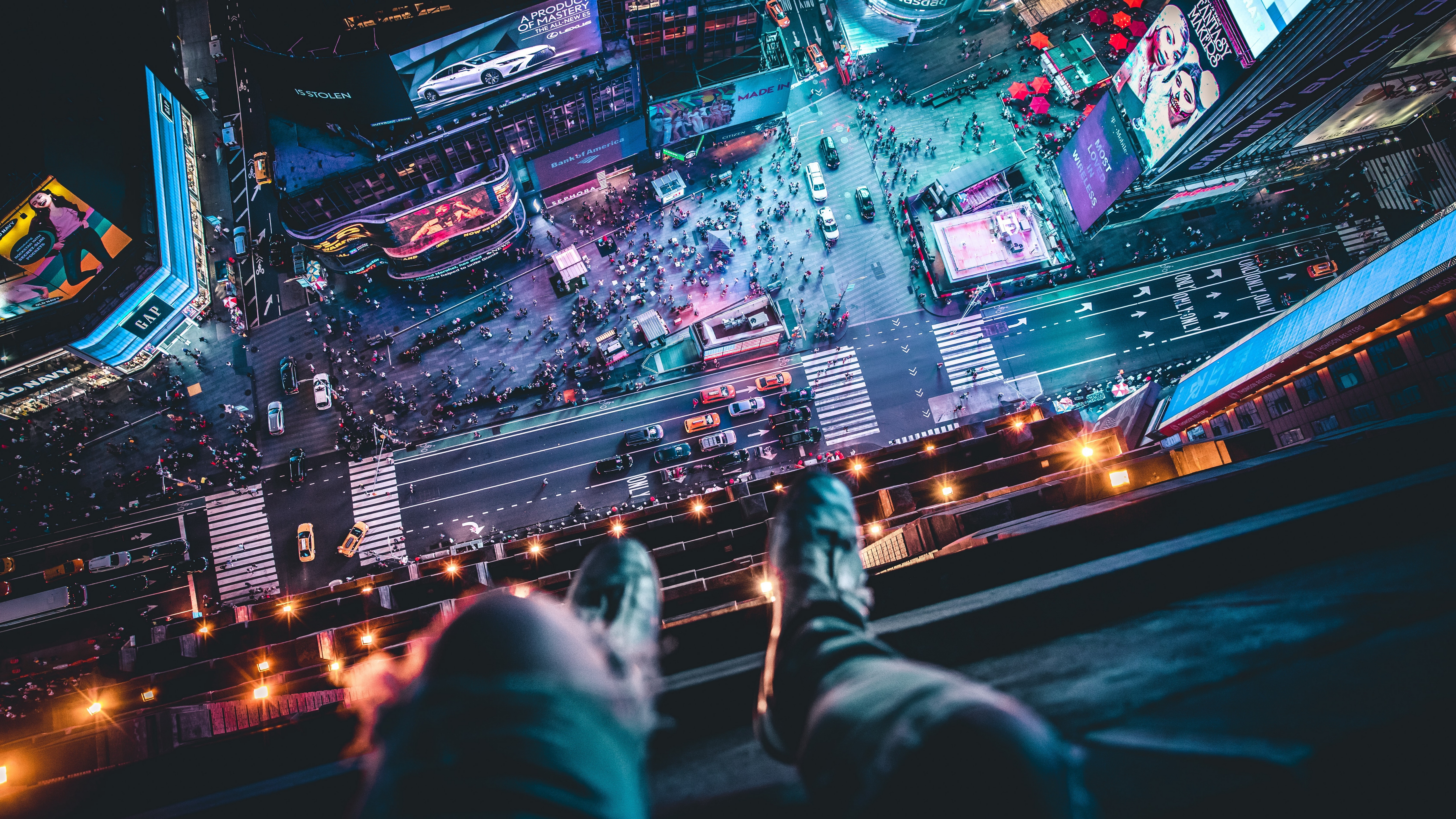 Description: A person standing on a ledge looking down at a city at night with lights and signs on the buildings.