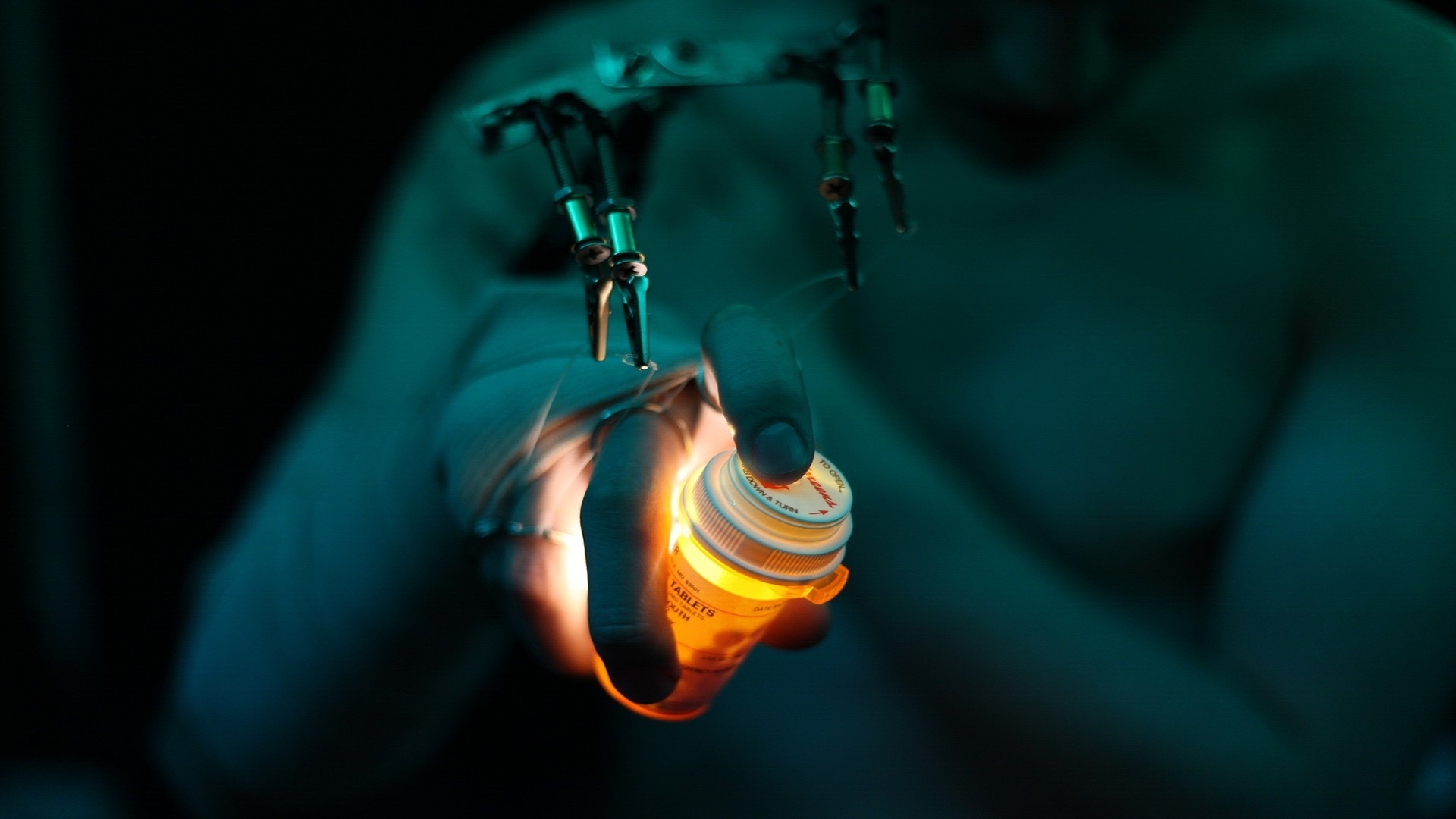 Description: A person holding a lit object in their hands with a green light shining on them and a black background.