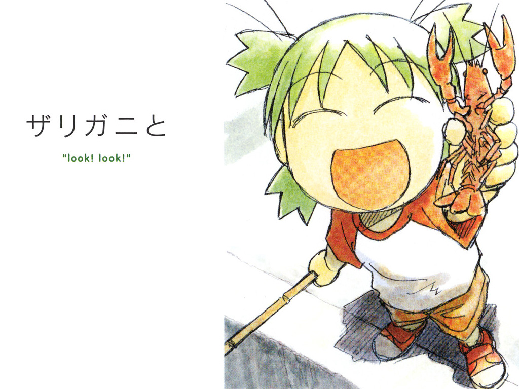 Description: A drawing of a person holding a stick and a lobster in their hand with a caption in japanese.