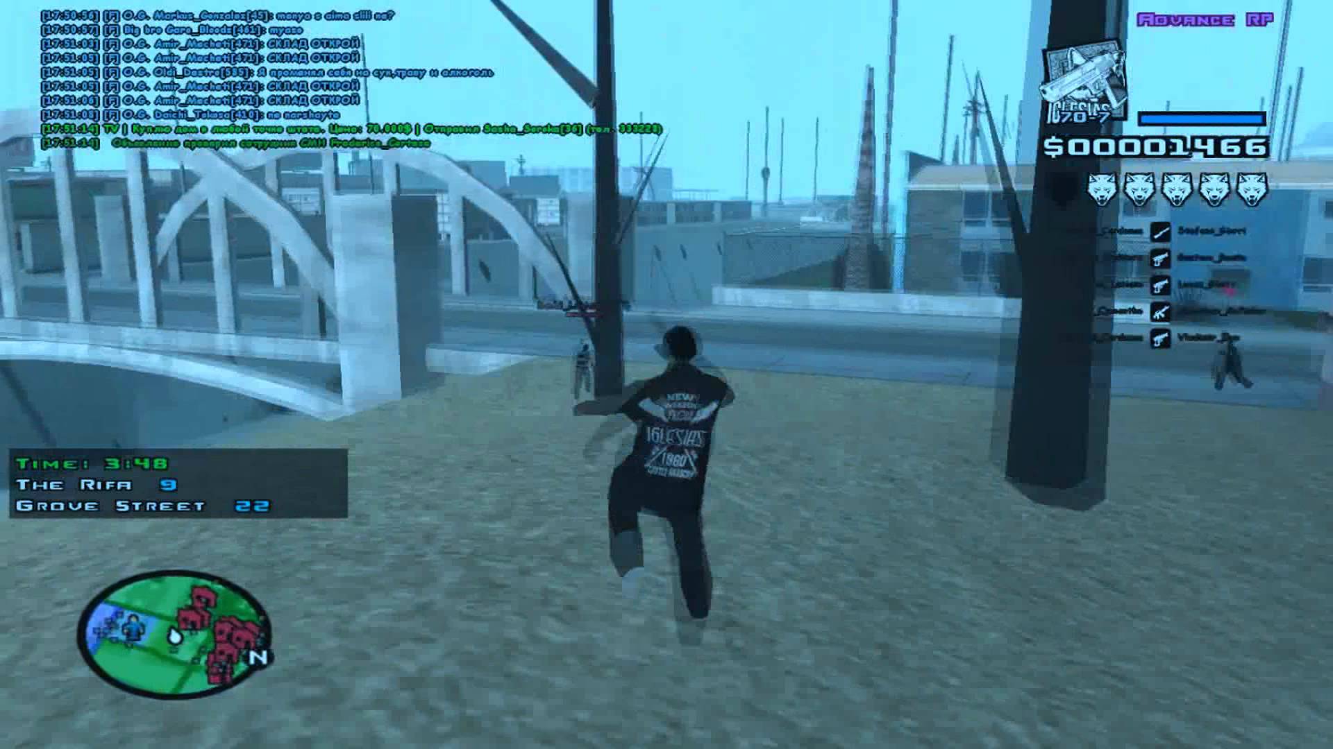Description: A person is playing a game on a computer screen in a city street with a bridge and a bridge.