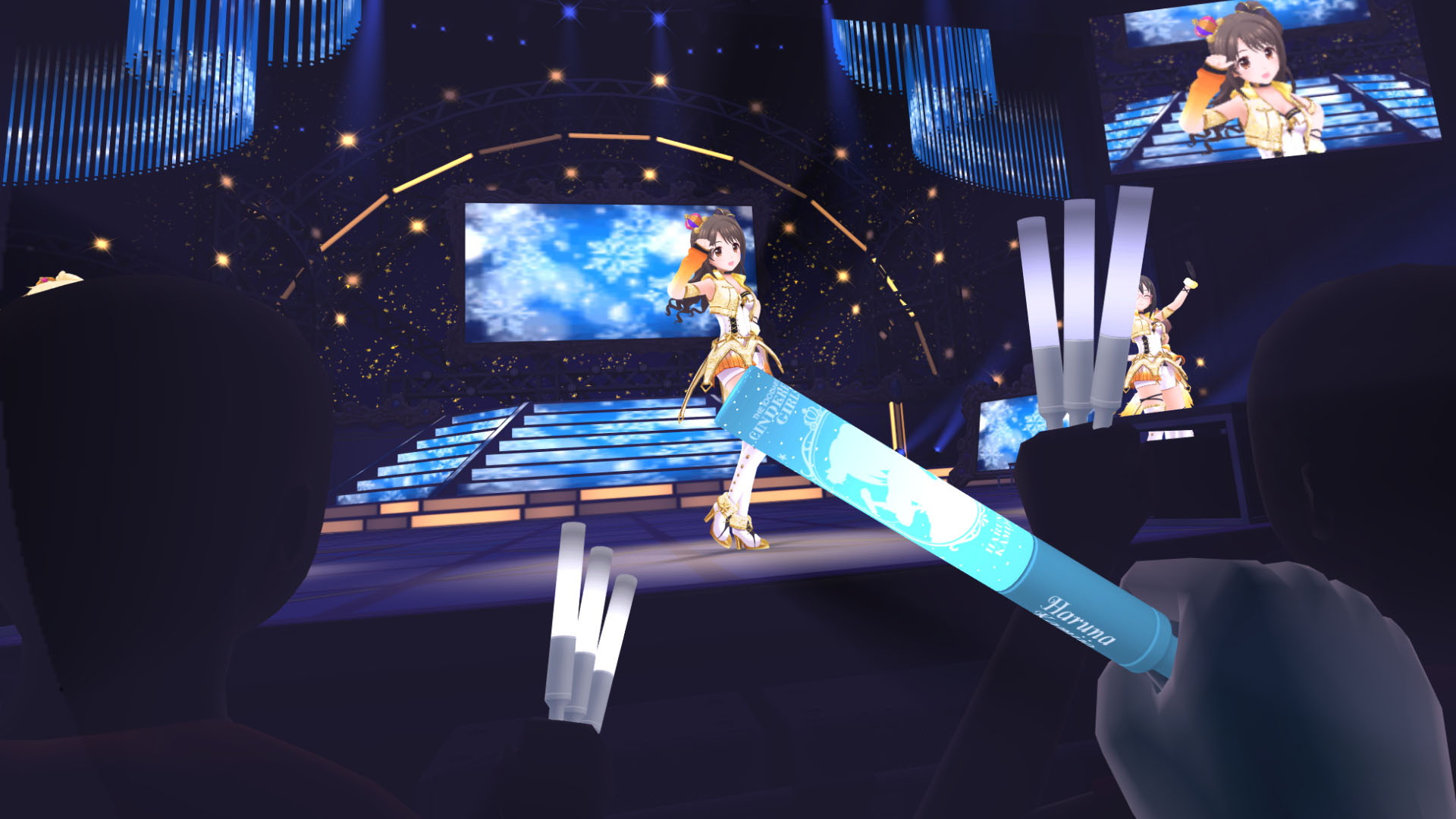 Description: A person is playing a video game on a stage with a microphone and a microphone stand in front of them.
