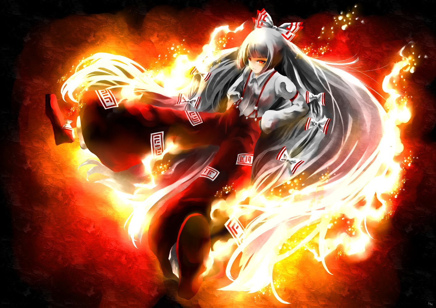 Description: A person in a red and white outfit with a sword in their hand and a fire behind them.