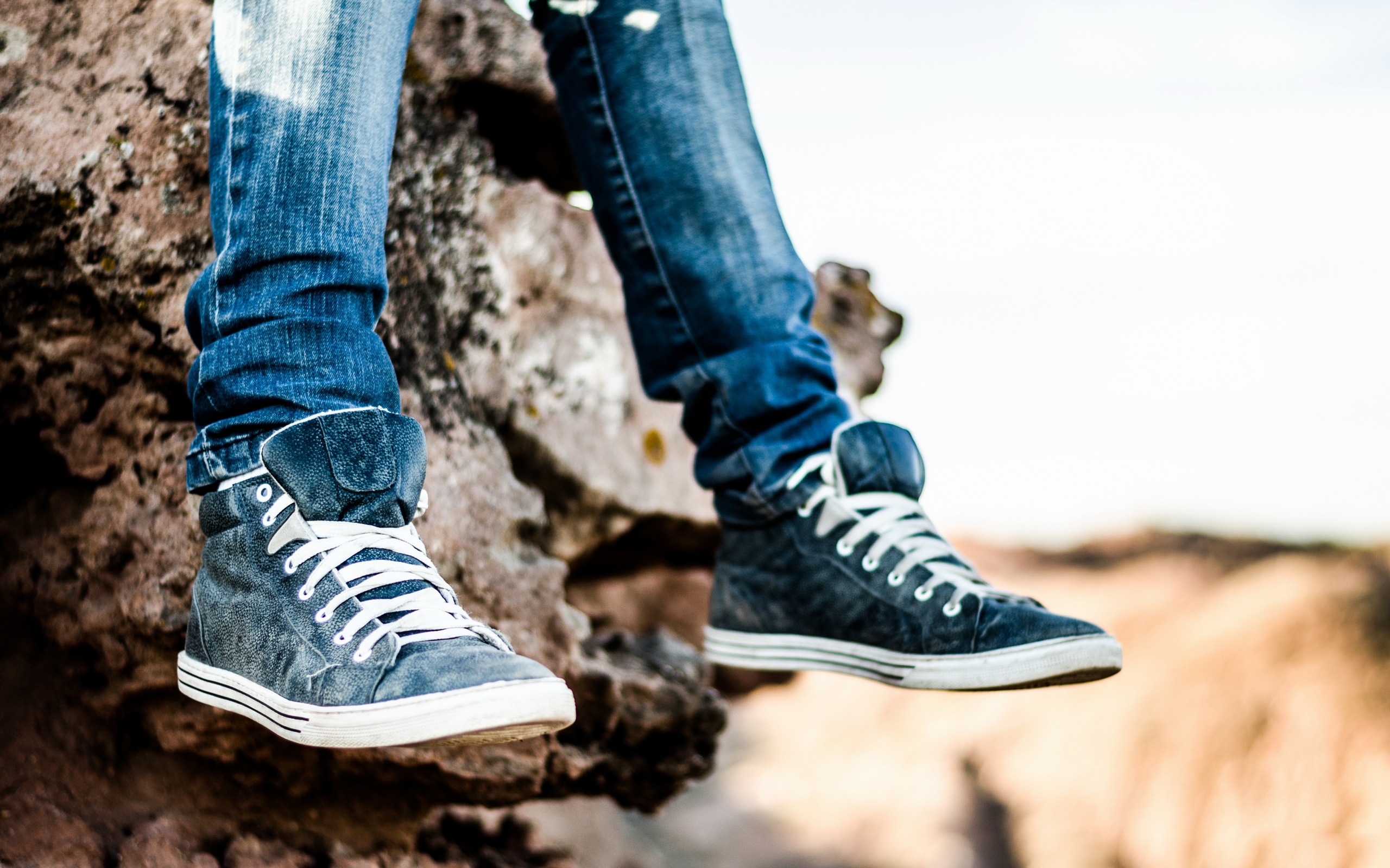 Description: A person standing on a rock with their feet up on the rock and their shoes on the ground.
