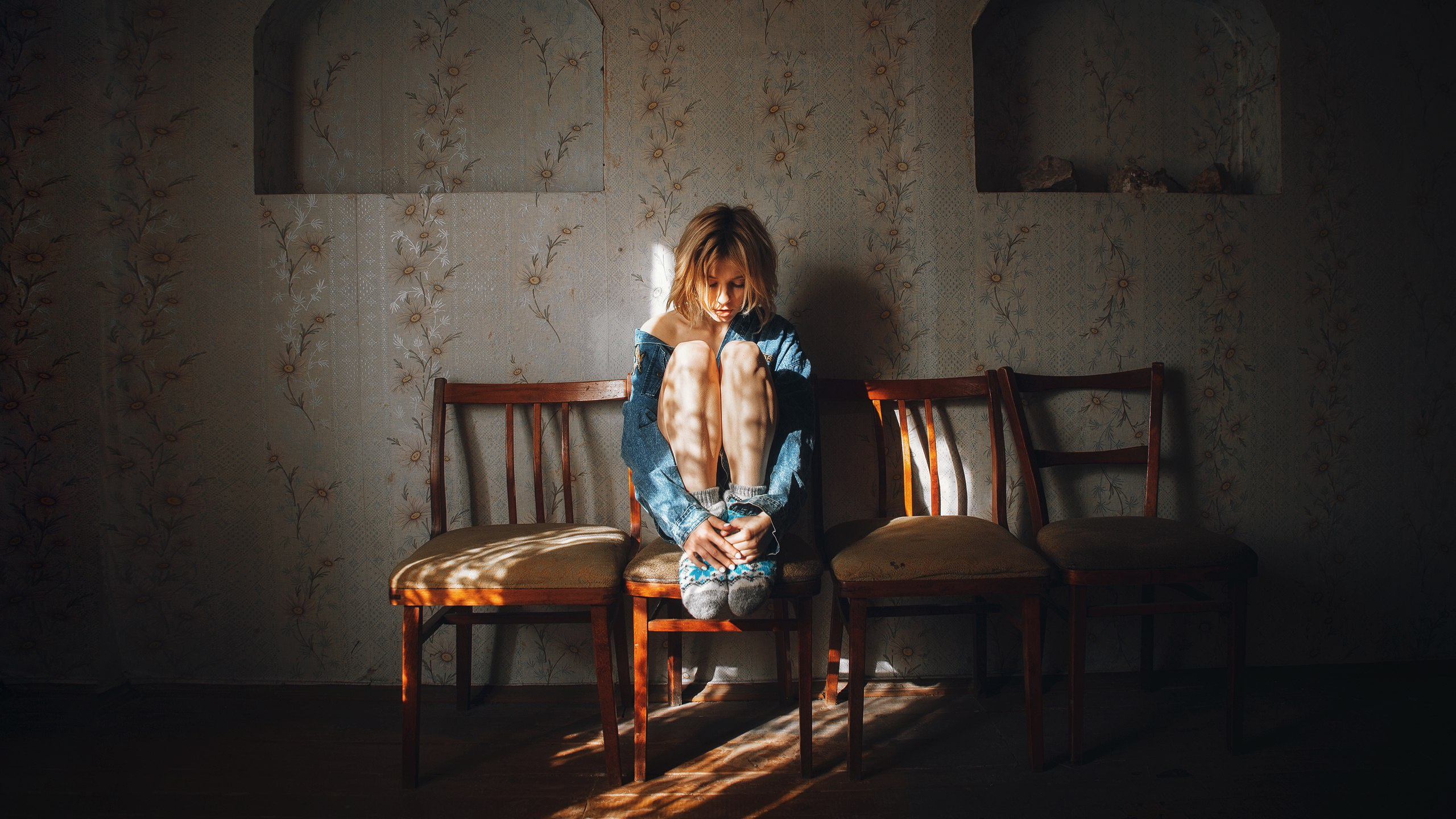Description: A person sitting on a chair in a room with a wallpapered wall and a chair with a person sitting on it.