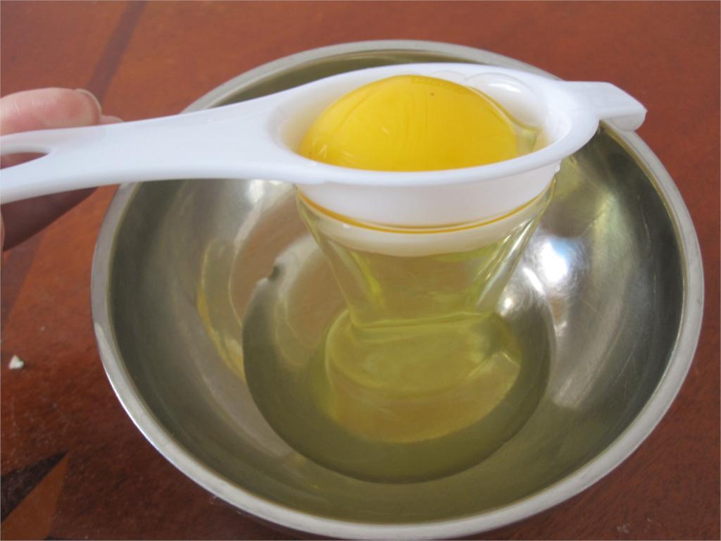 Description: A person is holding a spoon over a bowl with a liquid in it and an egg in it.