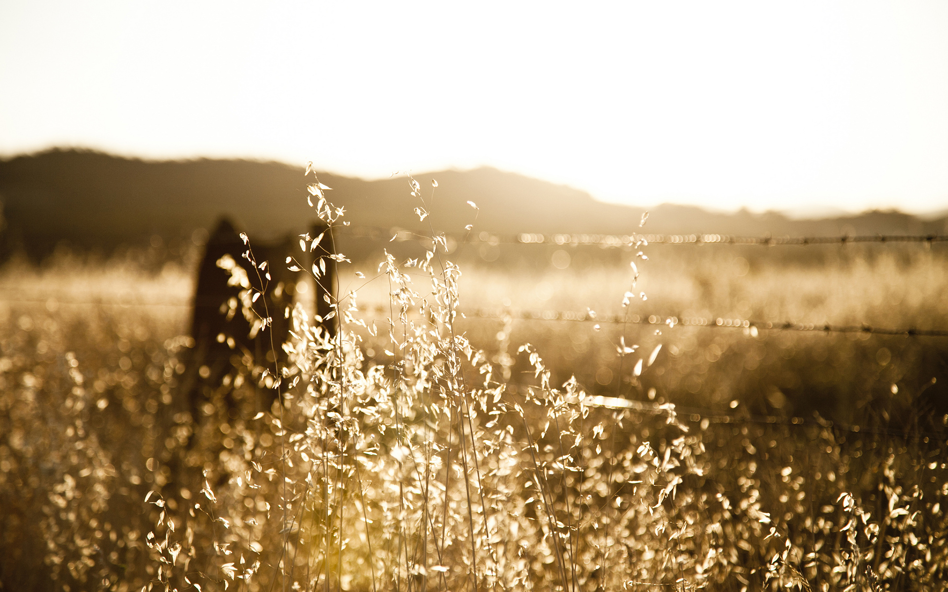 Description: A person standing in a field of tall grass with the sun shining on them and a fence in the background.