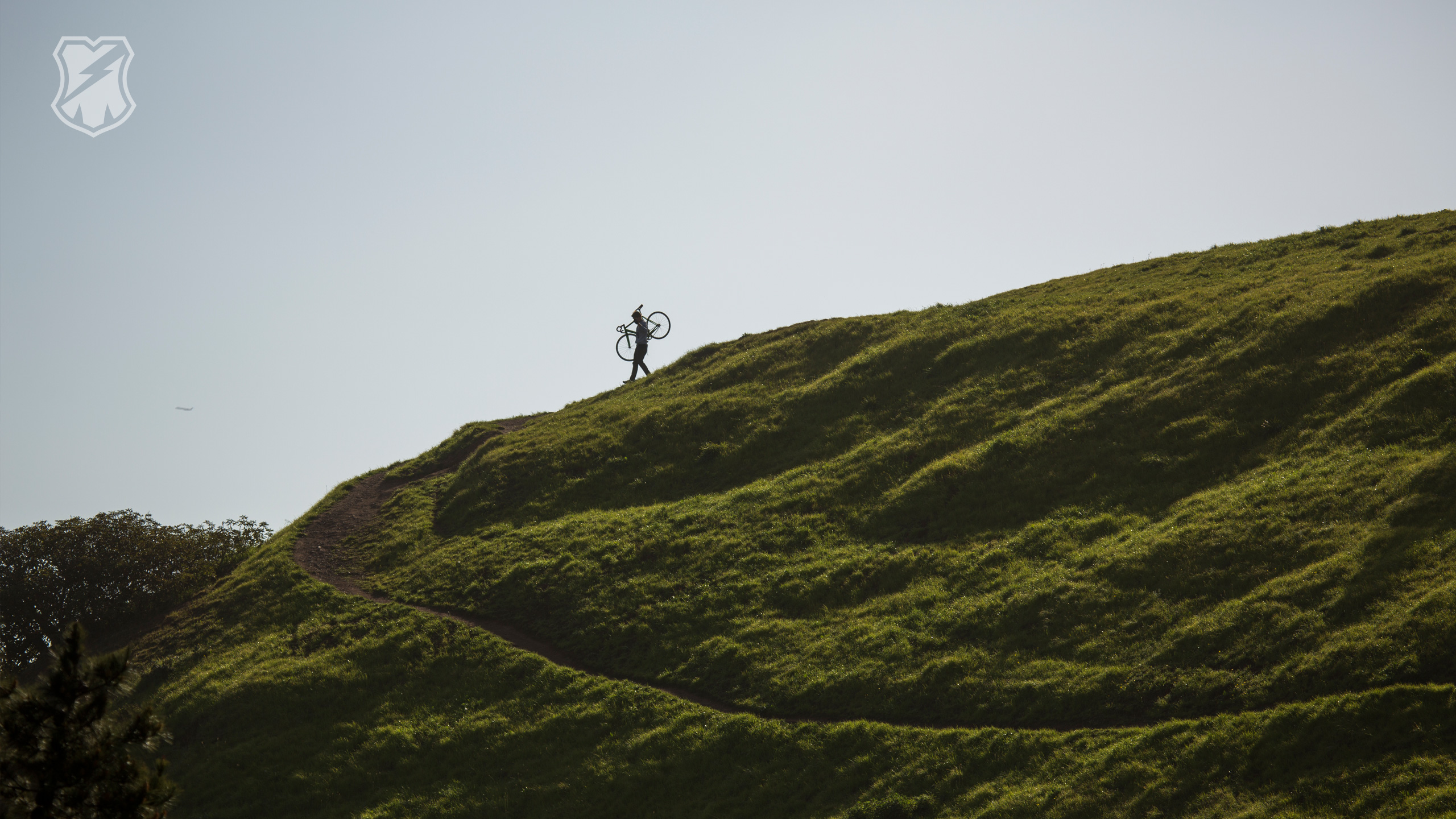 Description: A person standing on a grassy hill with a kite in the air above them and a tree on the top of the hill.