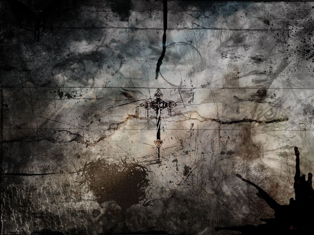 Description: A painting of a person standing in front of a wall with a sky background and a cross on it.