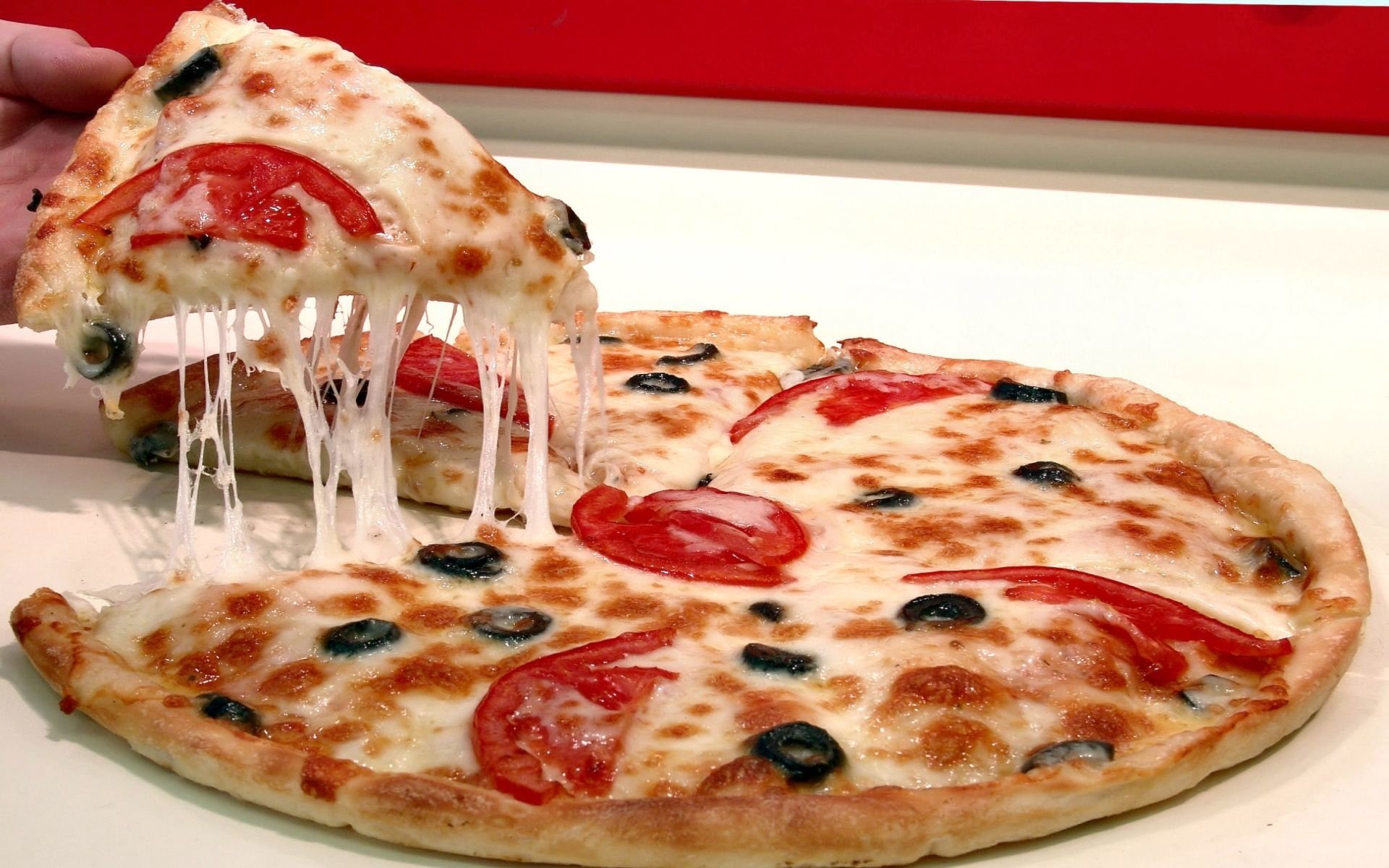 Description: A person is taking a slice of pizza with a fork and knife from a pizza on a white table.