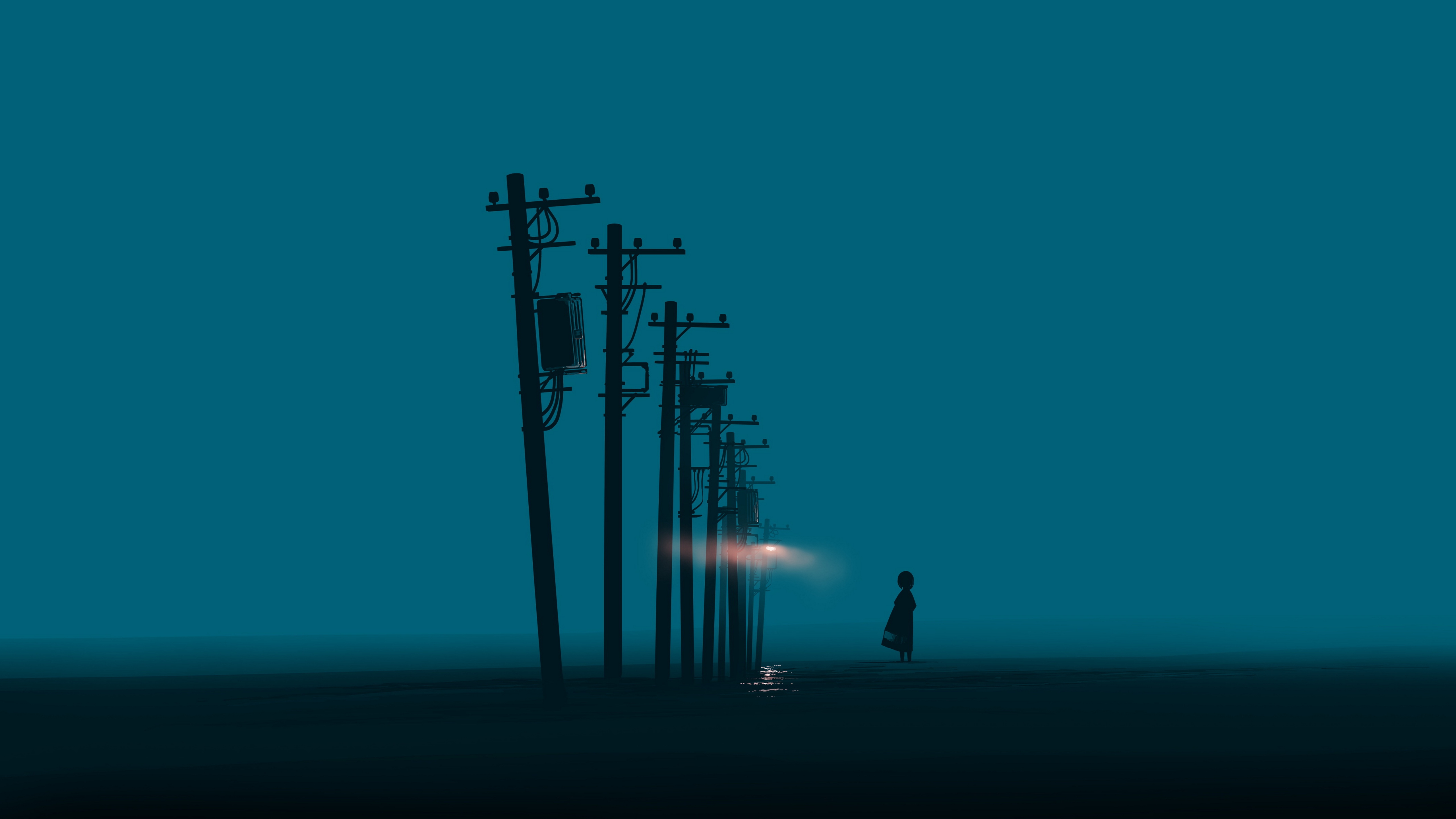 Description: A person standing in front of a row of telephone poles with a street light in the distance and a person walking away.