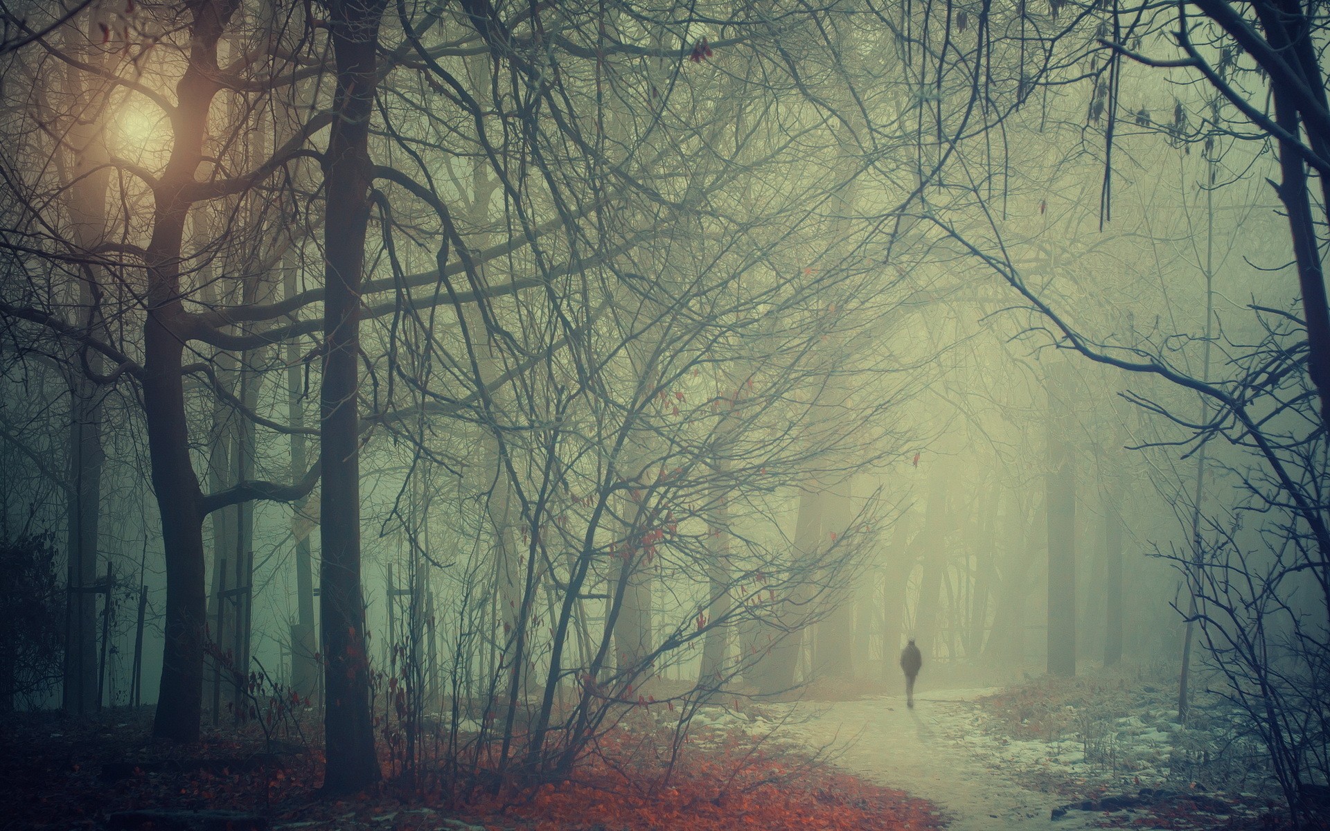 Description: A person walking through a forest with fog and trees on a path in the foreground.
